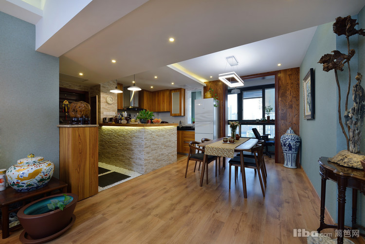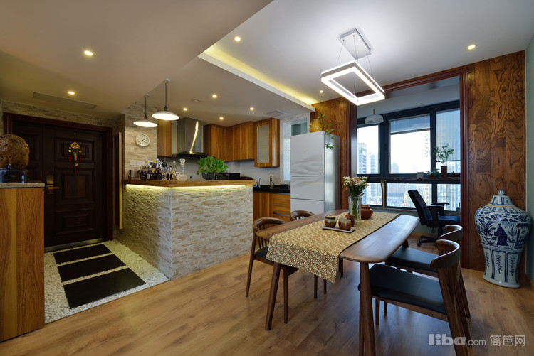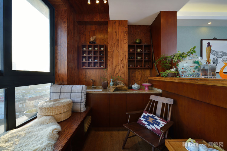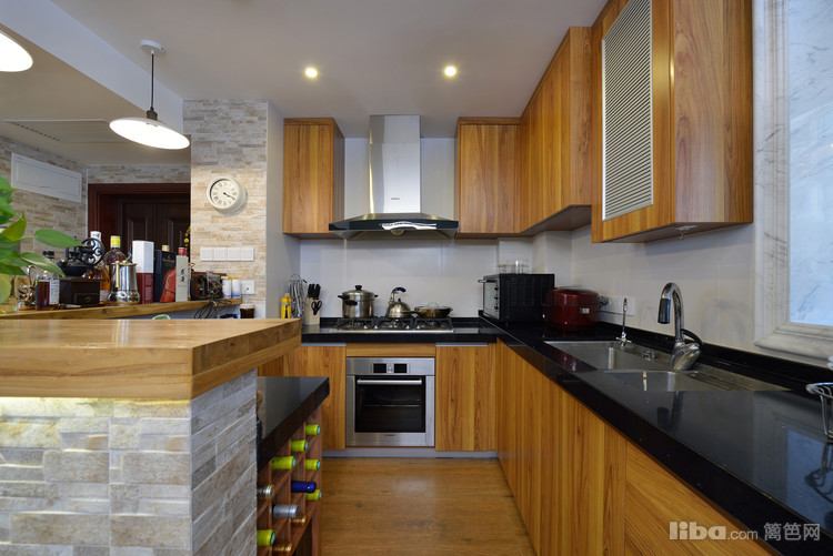 整间厨房采用了大量的木制材料和文化墙砖打造而成,利用角落一隅暗藏一套藏酒矮柜,实用的同时又节省出更多的空间。