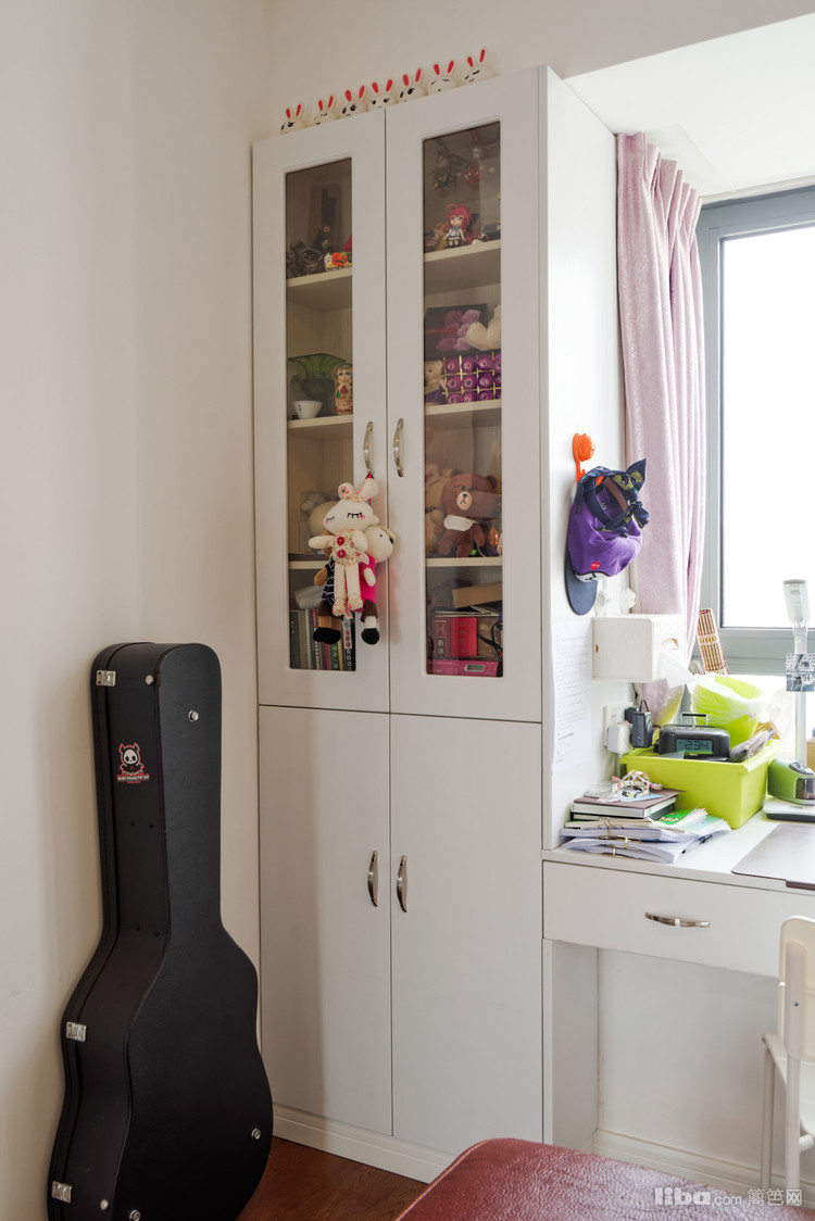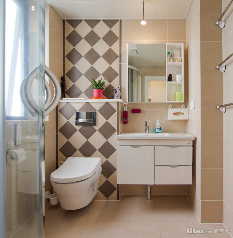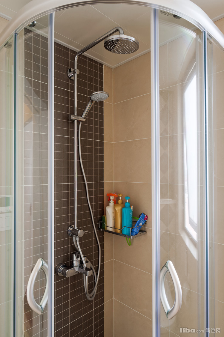 由于卫生间空间较小,设计师利用壁挂马桶和浴室柜,不占用地面空间,给人以视觉放大之感。淋浴房弧形设计,减少了棱角,实现了空间的最大化利用。