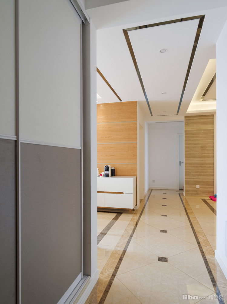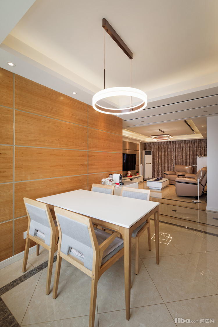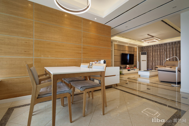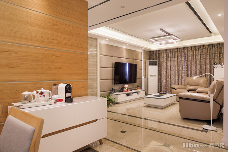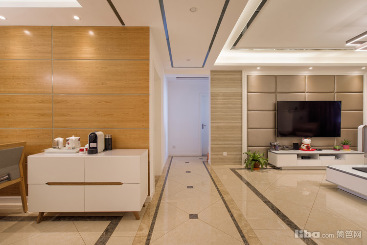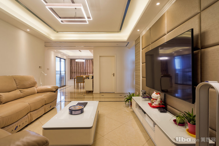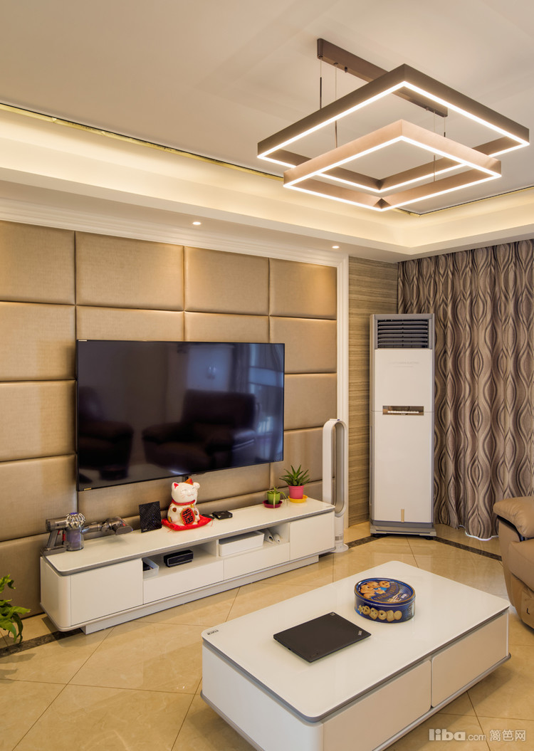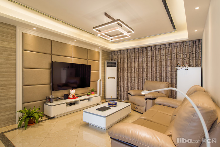 客厅装饰沉稳大气。现代新款时尚皮质沙发组合,电视背景墙以冷色的大地砖上墙与暖色软包结合,通过白色实木线条分割,造型别致的吊灯,与吊顶四周的灰镜环环相扣,抬眼望去,空间恍若渐次放大