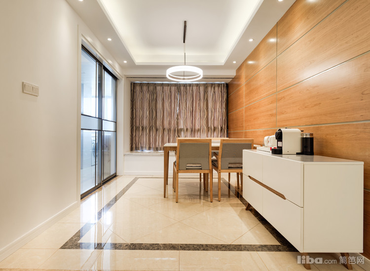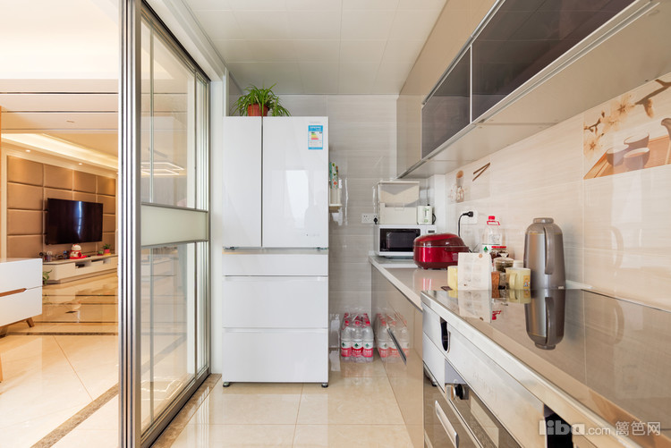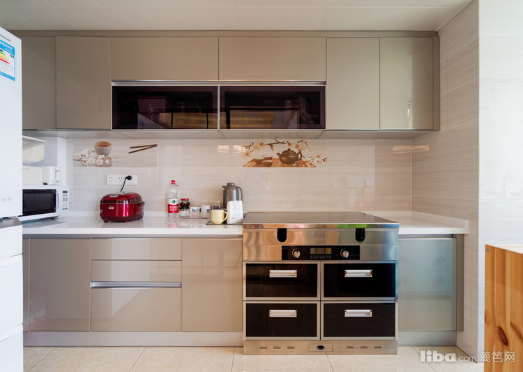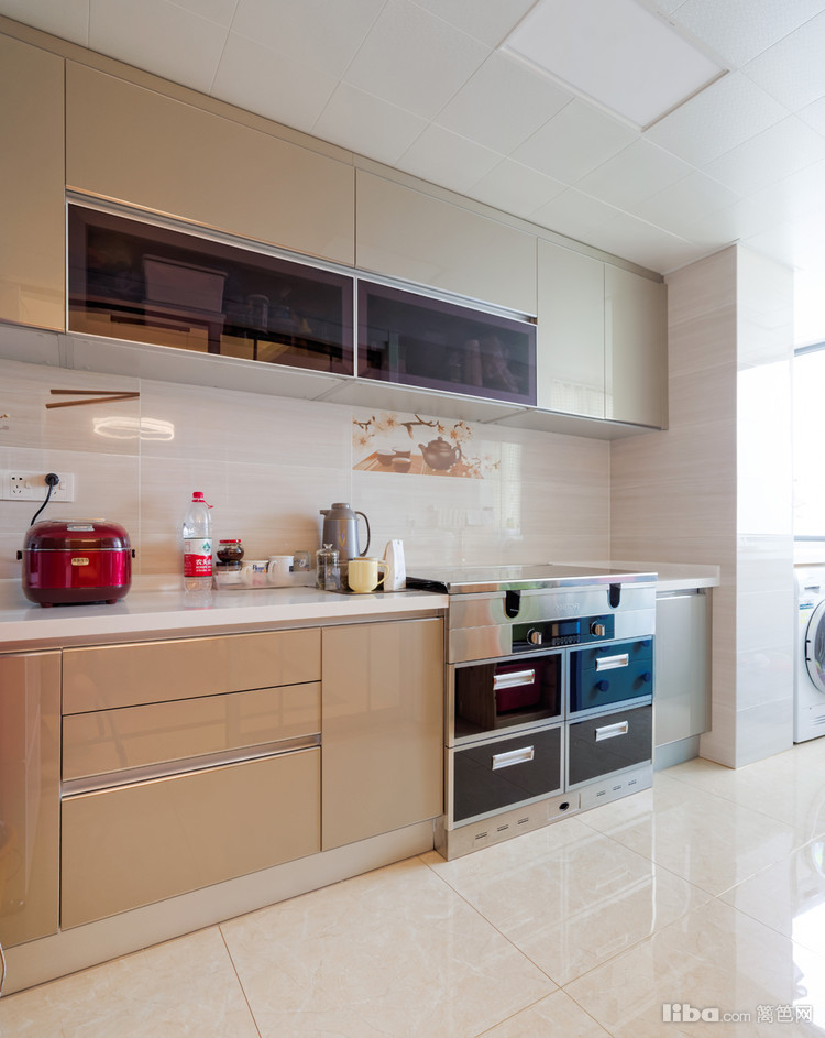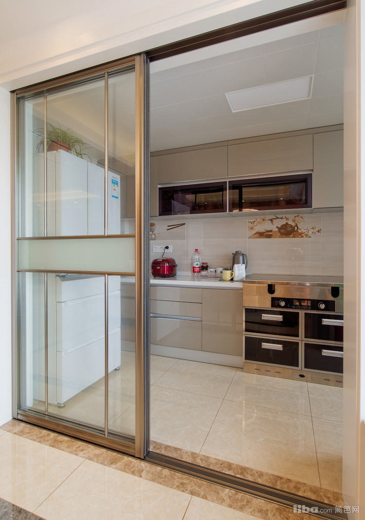 墙面的瓷砖素洁而富于变化,釉面砖肌理效果与橱柜的重色对比强烈,一体化的灶台无需安装油烟机。由于业主家宠物较多,设计师将阳台并入厨房解决了业主烦恼的宠物淋浴空间问题。