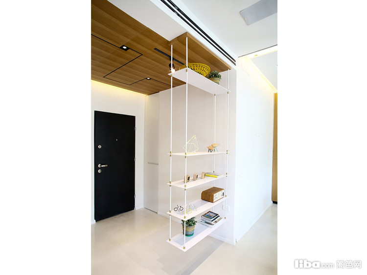 进门以简易的吊架作为隔断,隔而不断,架子可以放随身物品。必备的鞋柜做了嵌入设计,藏进了墙里。