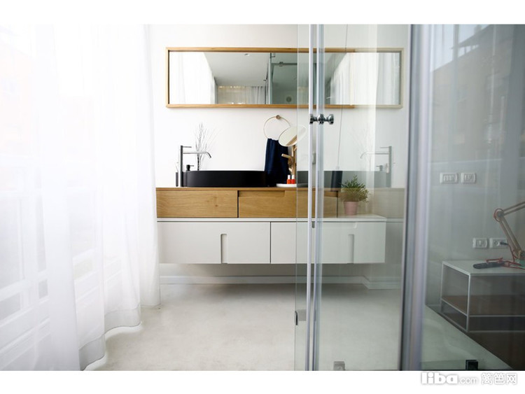 利用玻璃做到卫生间的干湿分区,浴室柜造型独特,收纳性能强。