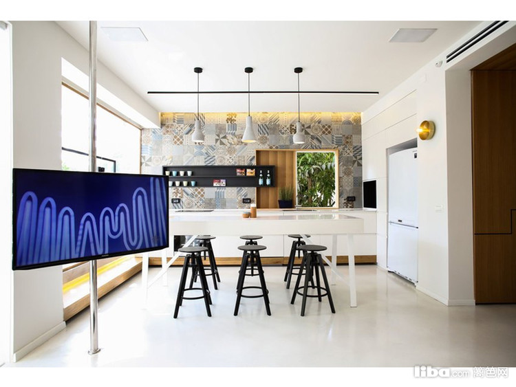 吧台式的餐桌+高脚凳,无论是用餐,还是放松小憩,都无比惬意。餐厅后是厨房,透过窗户直接面对着茂盛的树木。