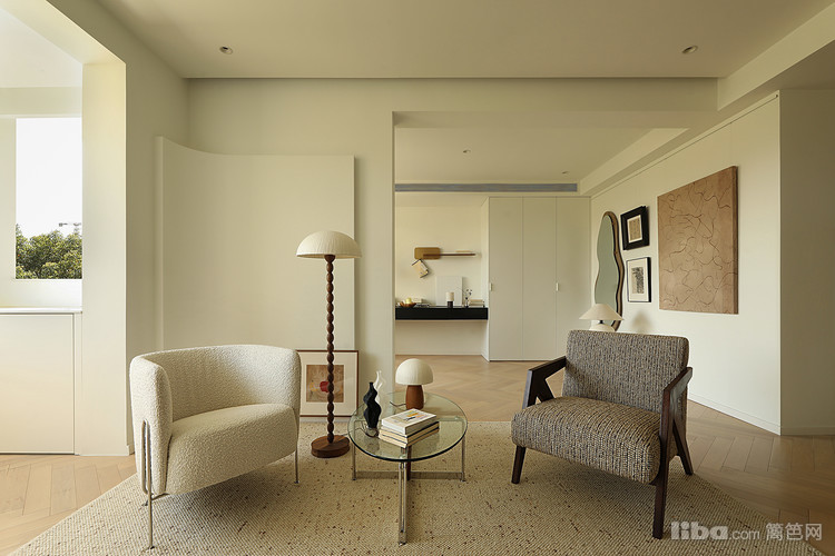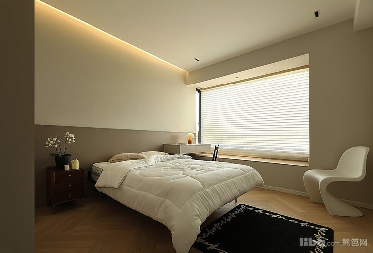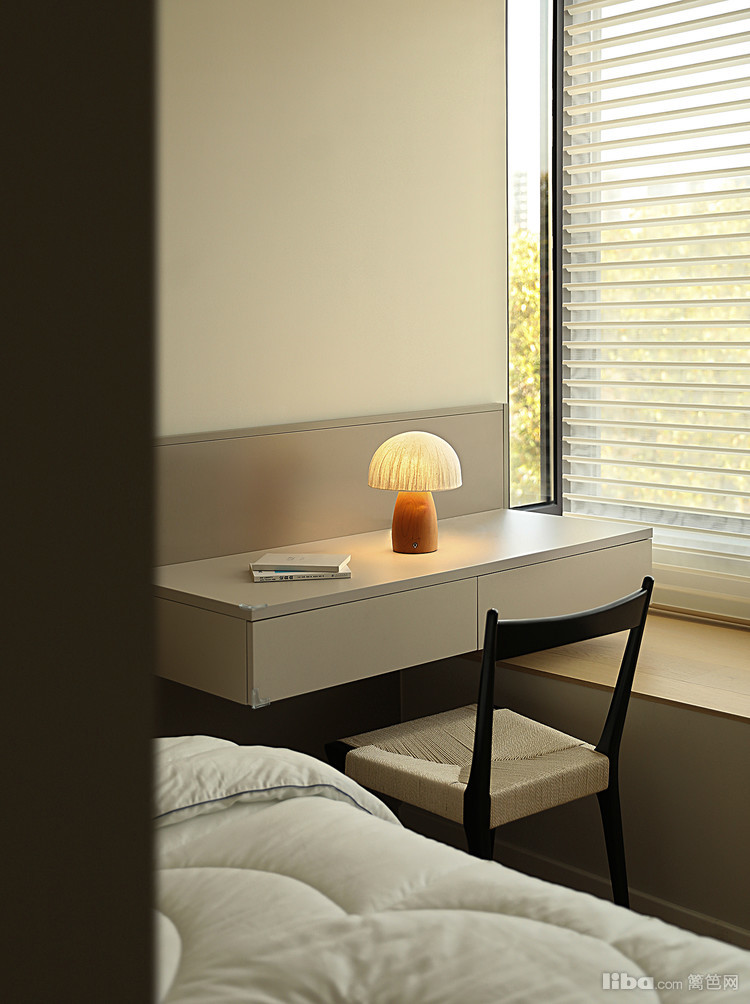 空间内以暖白色打造干净柔和的空间基调,少许亮色点缀,凸出视觉层次感,呈现出一种宁静舒适的亲切感