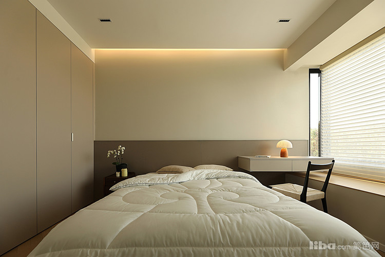 卧室的空间氛围温馨,呼应客厅的大地色,墙面上下的分色搭配,丰富了空间层次感