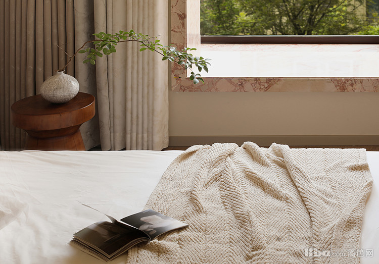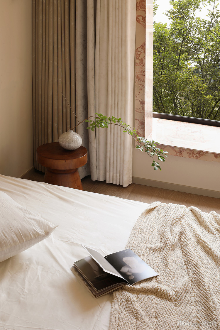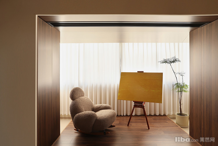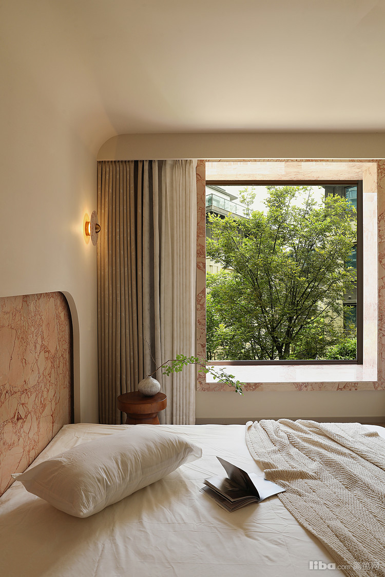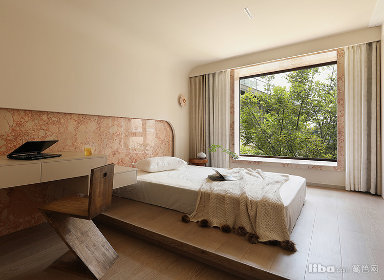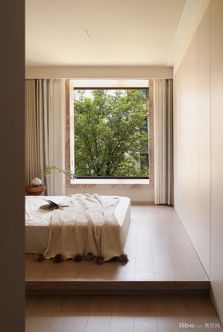 圆弧的吊顶装饰天花则自带法式的浪漫精致感。抬高地台搭配双人床,贴近自然的木地板的搭配,更是让主卧底色简洁而不失层次