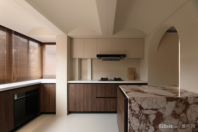 厨房以U型结构为主,让下厨变得更加从容不迫。中古的地柜与木百叶帘的融合,室外美景充足映入眼帘,同时保证空间的私密性,实现了客餐厨LDK一体格局的完美融合
