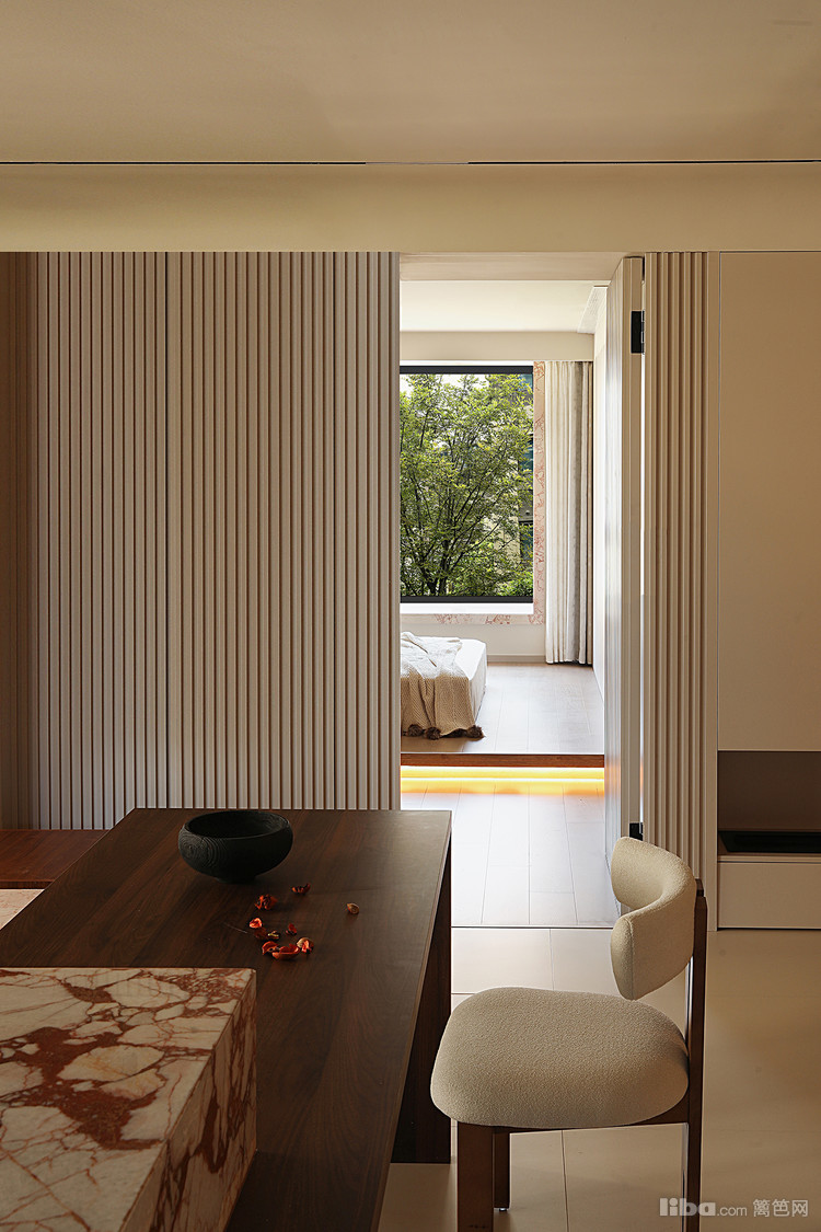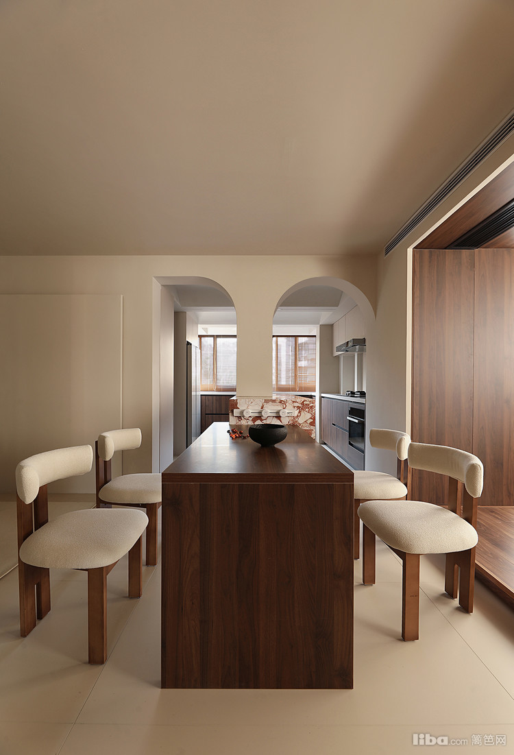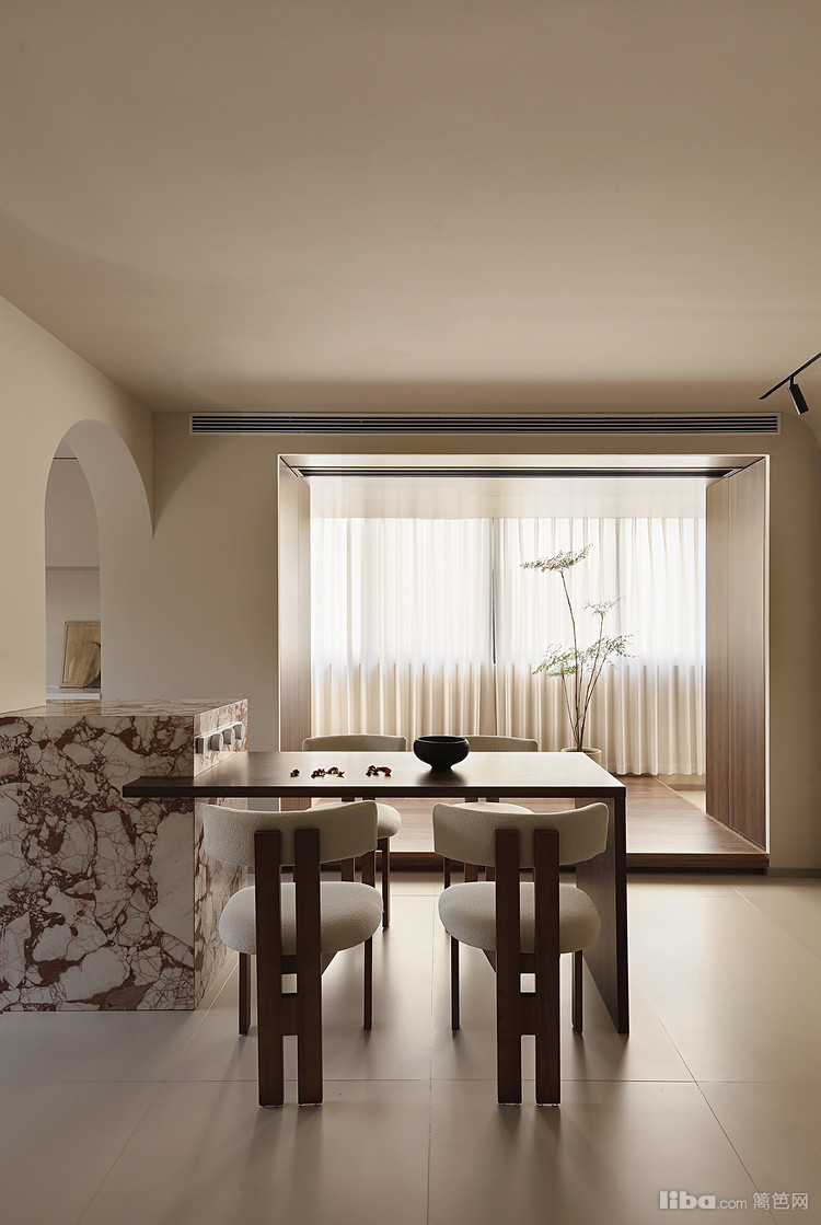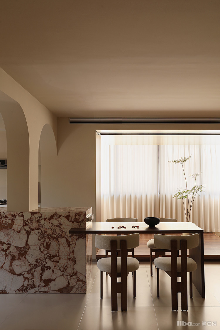 餐厅与相连接的客厅以及厨房形成了开放式,贯穿空间的起居格局,弱化区域边界的同时,却又保留了各自的独立性