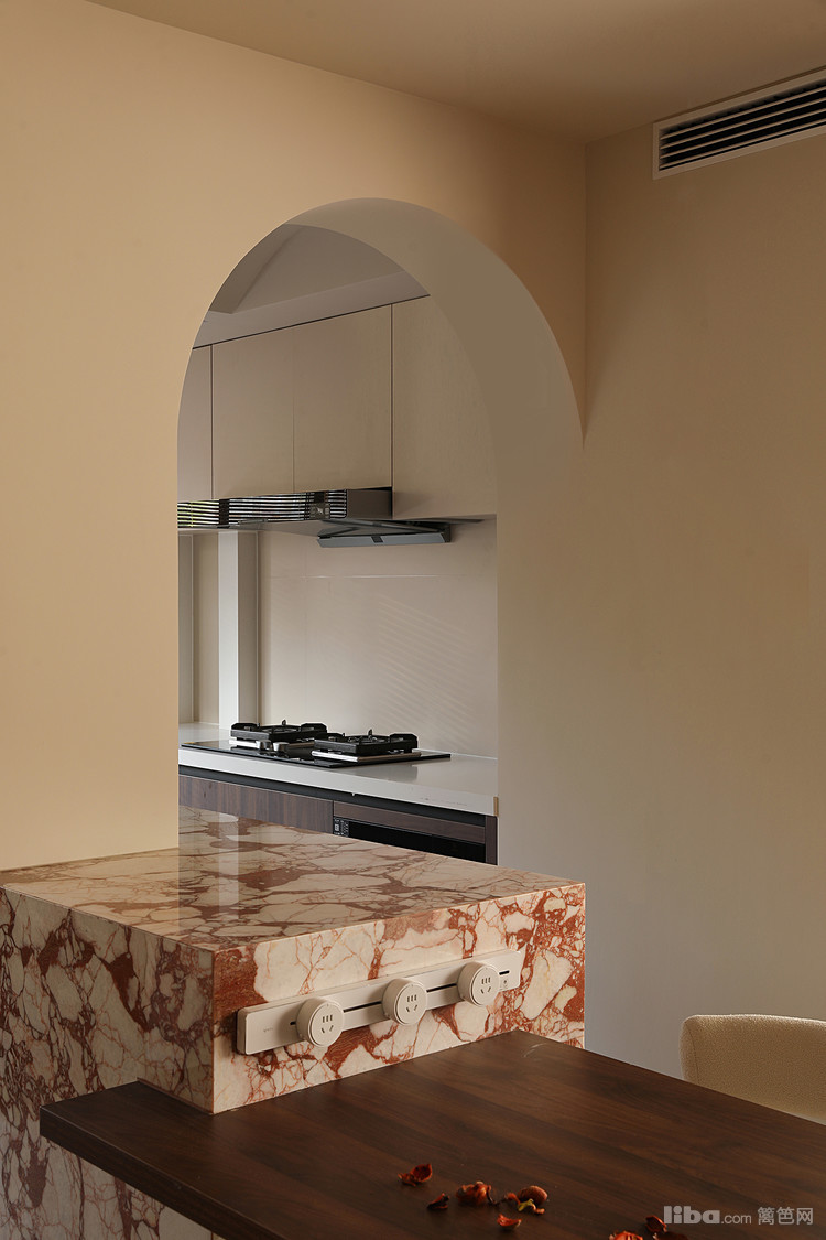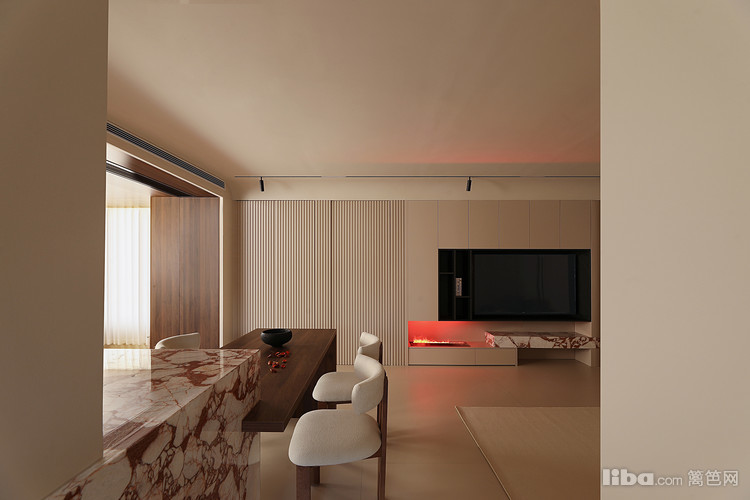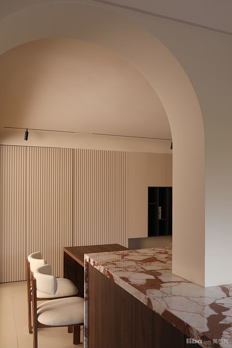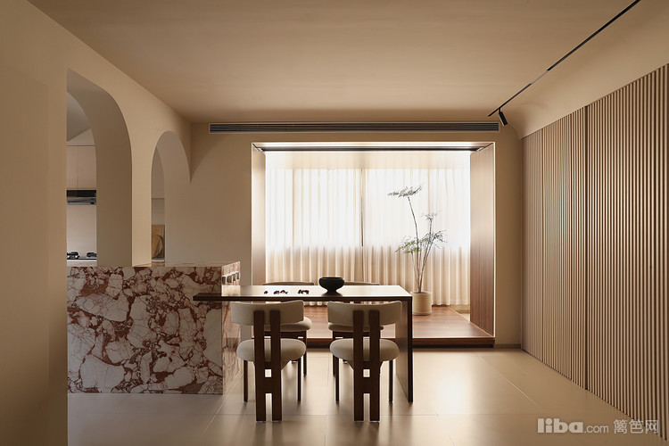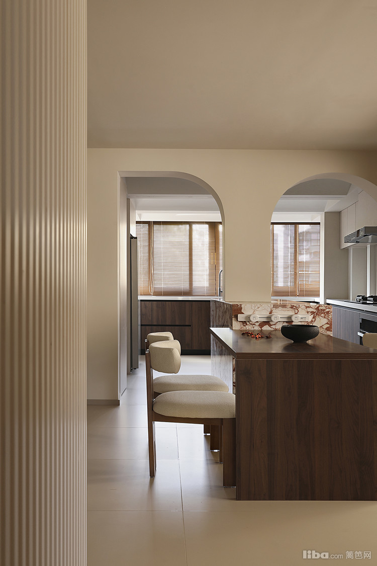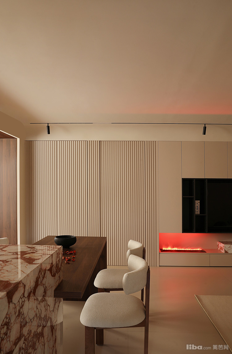 餐厅与相连接的客厅以及厨房形成了开放式,贯穿空间的起居格局,弱化区域边界的同时,却又保留了各自的独立性