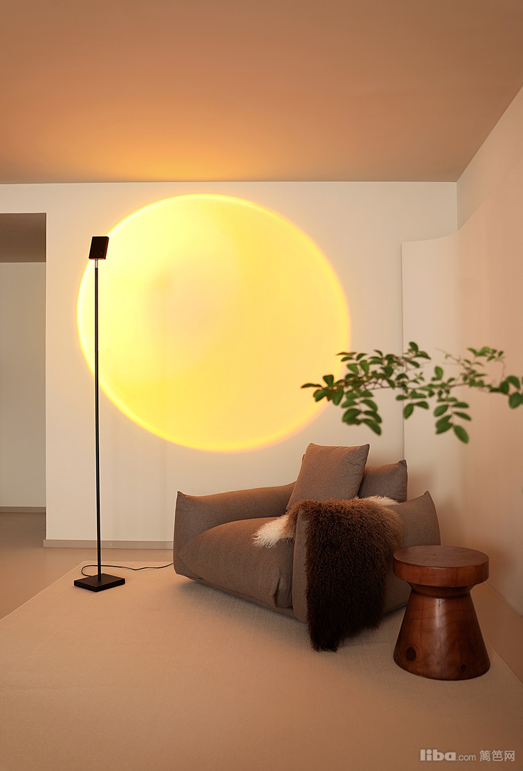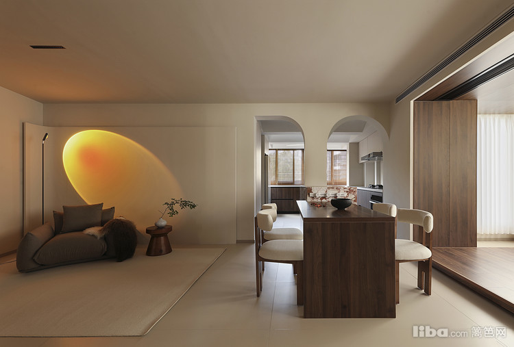 客厅是家的中心,也是家人聚集、交流的重要场所。设计师利用奶油乳胶漆、拱形元素、中古原木等,形成强烈的视觉对比