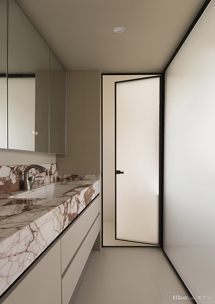 以黑框的极简磨砂玻璃门为隔断,进门一侧是浴室柜,壁挂式的设计与棕色花纹石材融合,具备收纳能力的浴室镜搭配其中,轻松解决卫浴整体的储物压力。