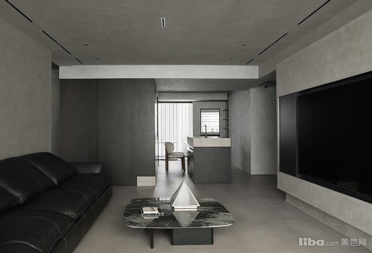 低饱和度的配色,让客厅空间的高级感十足,水泥色的自流平地面与微水泥墙面极为巧妙地营造了独特而硬朗的生活情调