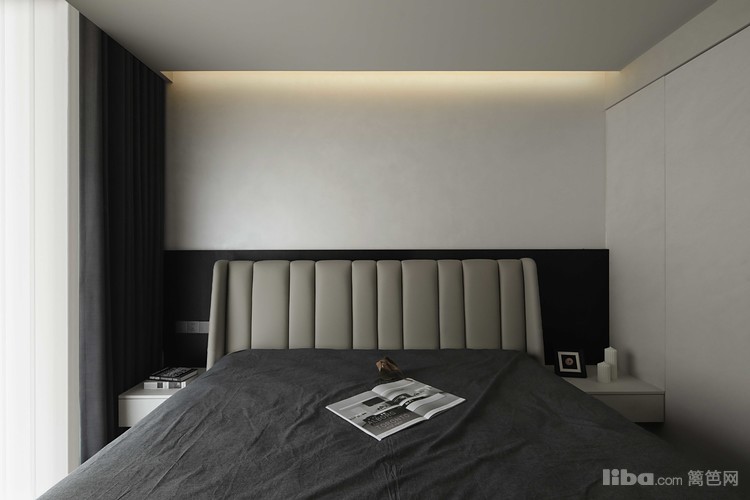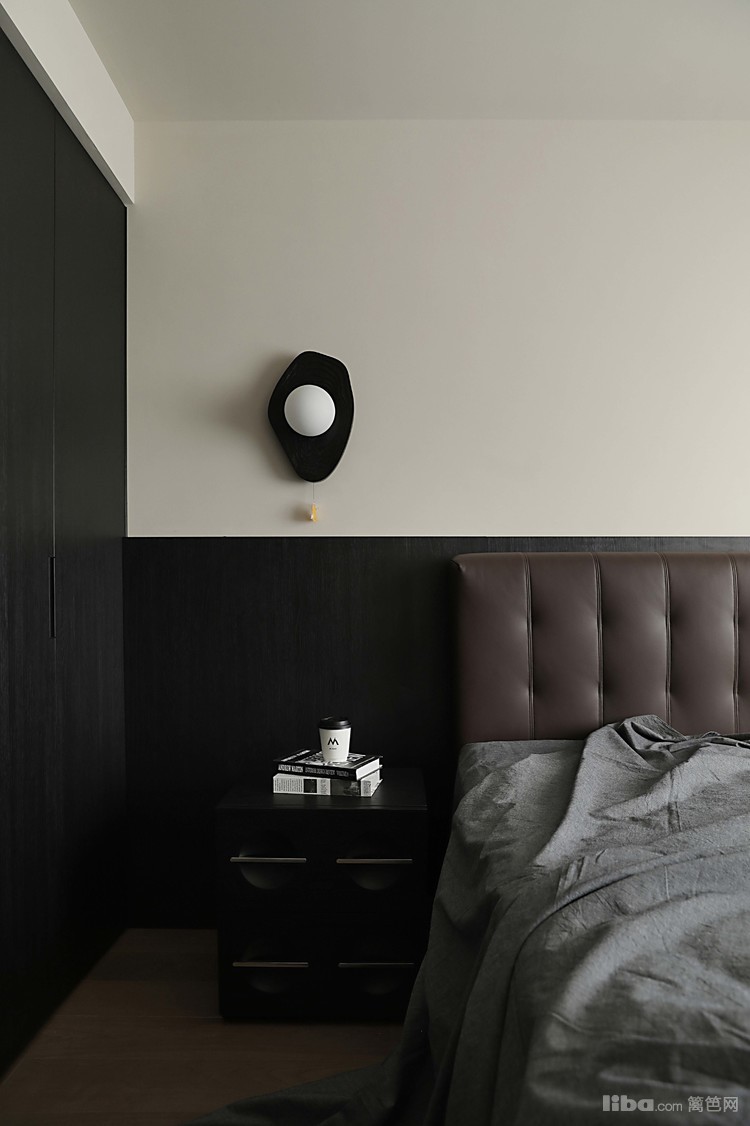 床头背景墙是卧室最大的造型立面,这里选择的是半墙护墙板加收纳柜的组合形式