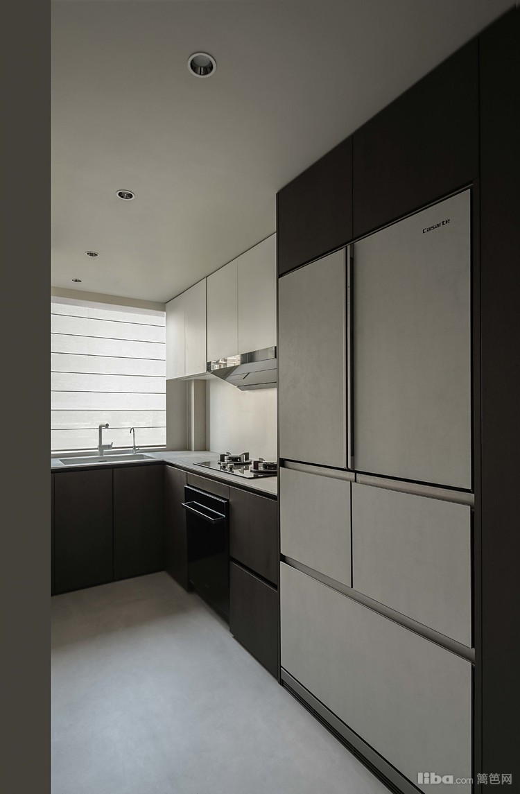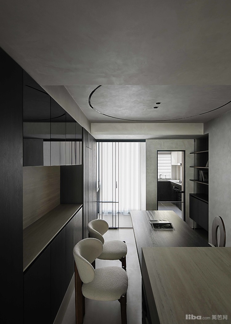 厨房做L形布局,最大化的满足收纳与操作空间,冰箱迁入柜体中,增加了厨房的操作空间和收纳,一切都是为了让操作者更为宽松舒适,胡桃木色的柜门与微水泥色调统一,相互映衬,经久耐看