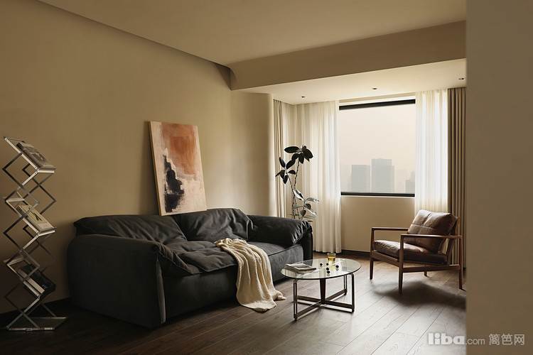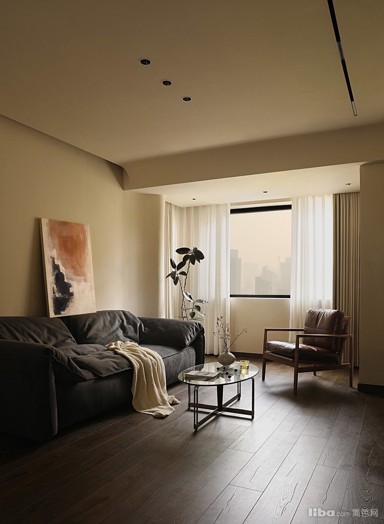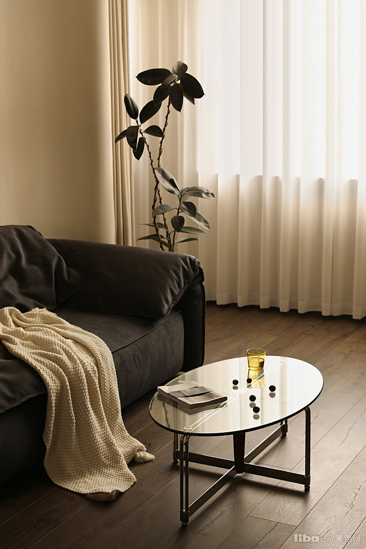 客厅以奶咖色作为主色调,搭配米色、暖灰色、深色木纹等饱和度较低明度较高的色彩,呈现出细腻的空间感。