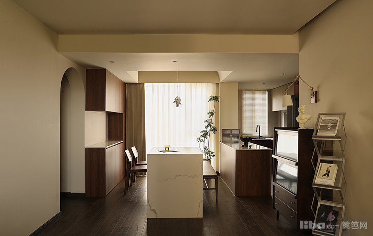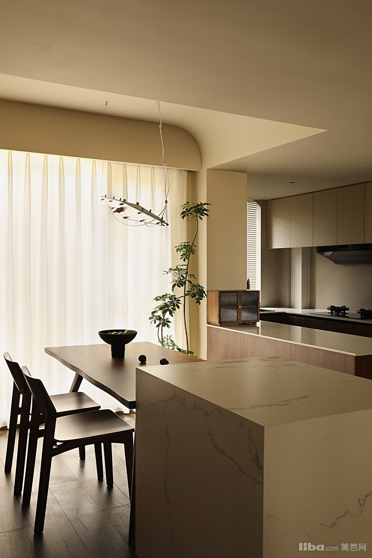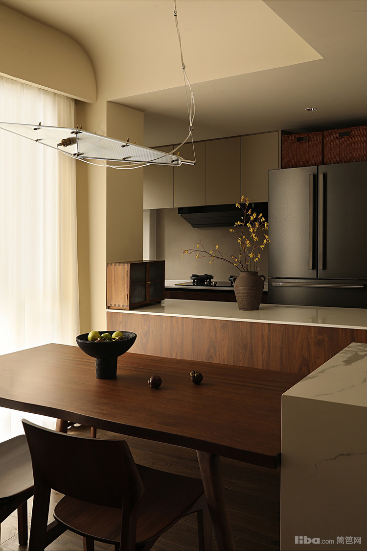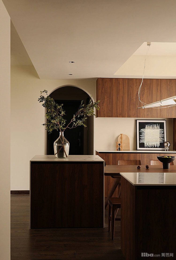 餐厅用岛台和胡桃木色桌子做搭配,岛台作为隔断,起到半遮挡的作用,将空间进行合理的划分,既好看又实用。