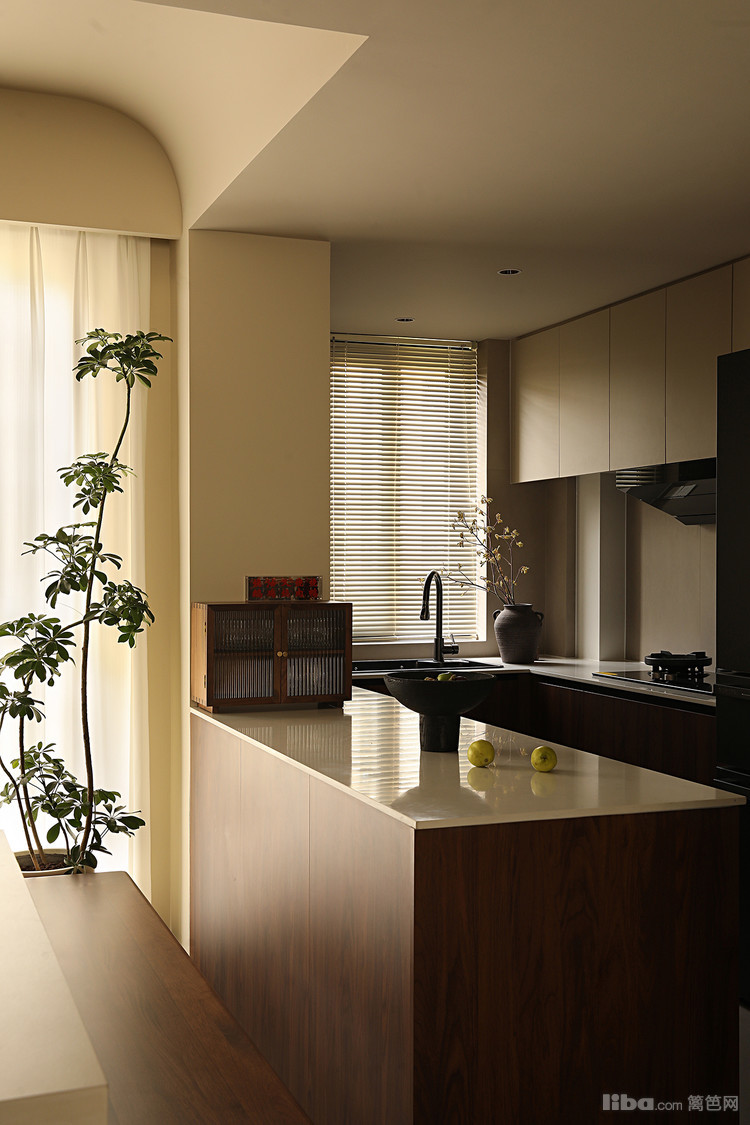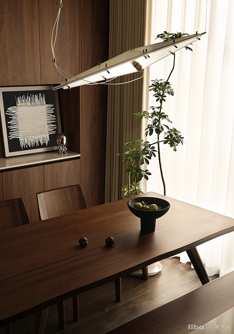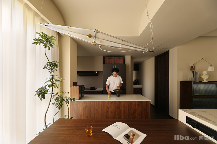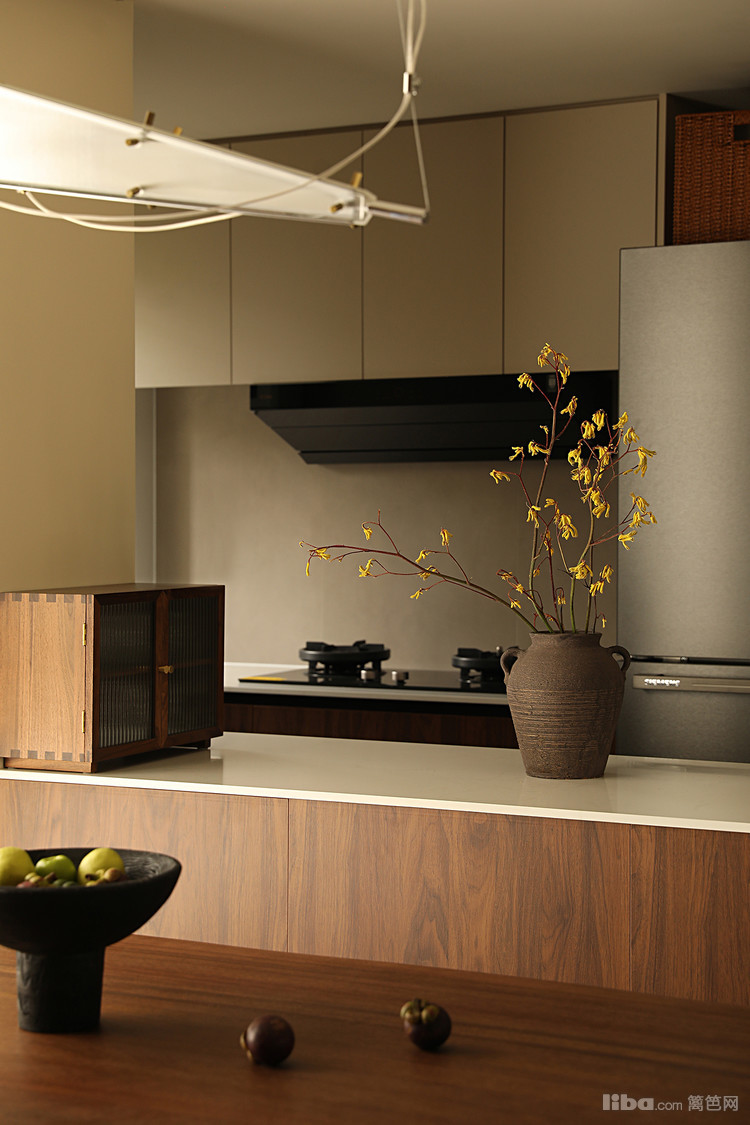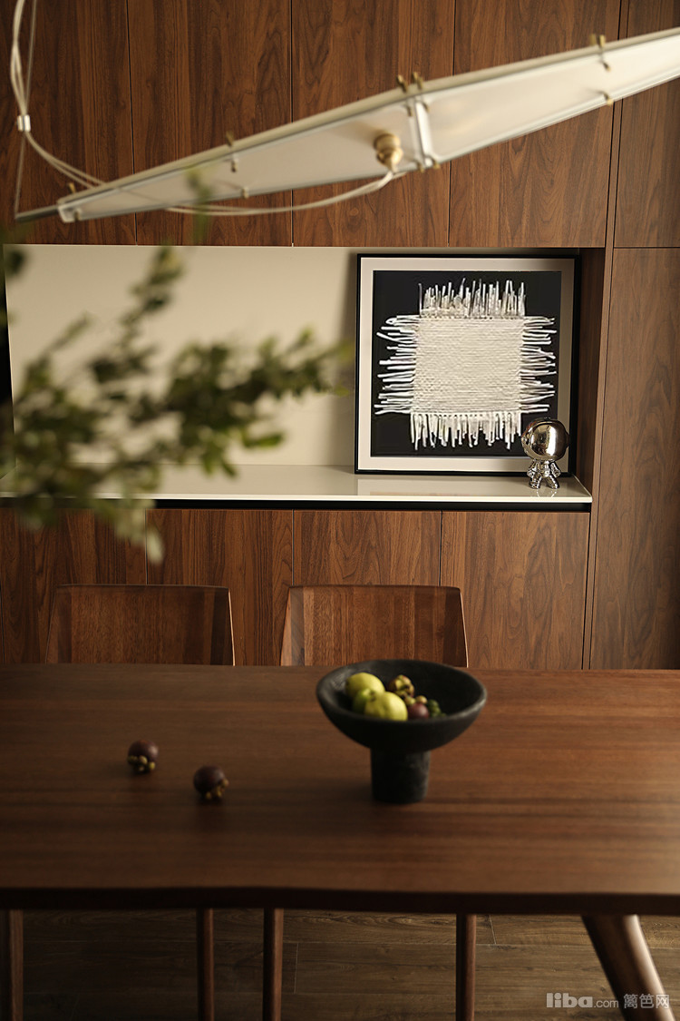 餐厅用岛台和胡桃木色桌子做搭配,岛台作为隔断,起到半遮挡的作用,将空间进行合理的划分,既好看又实用。