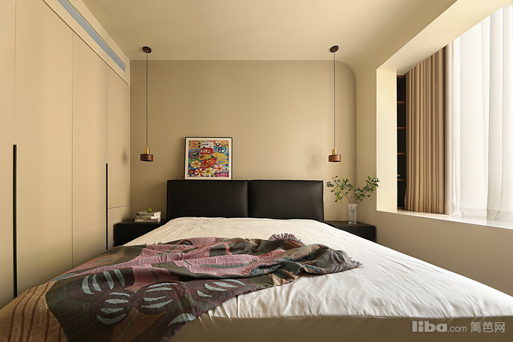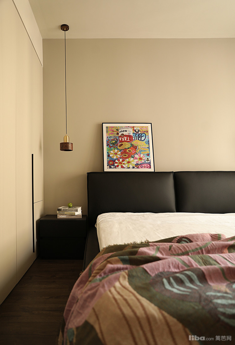 卧室空间设计比较简约,背景墙选择奶油色乳胶漆通刷,营造出一种宁静、舒适的休息空间。对于软装搭配上以深色系为主,两侧的吊灯延伸至此,形成复古的调性