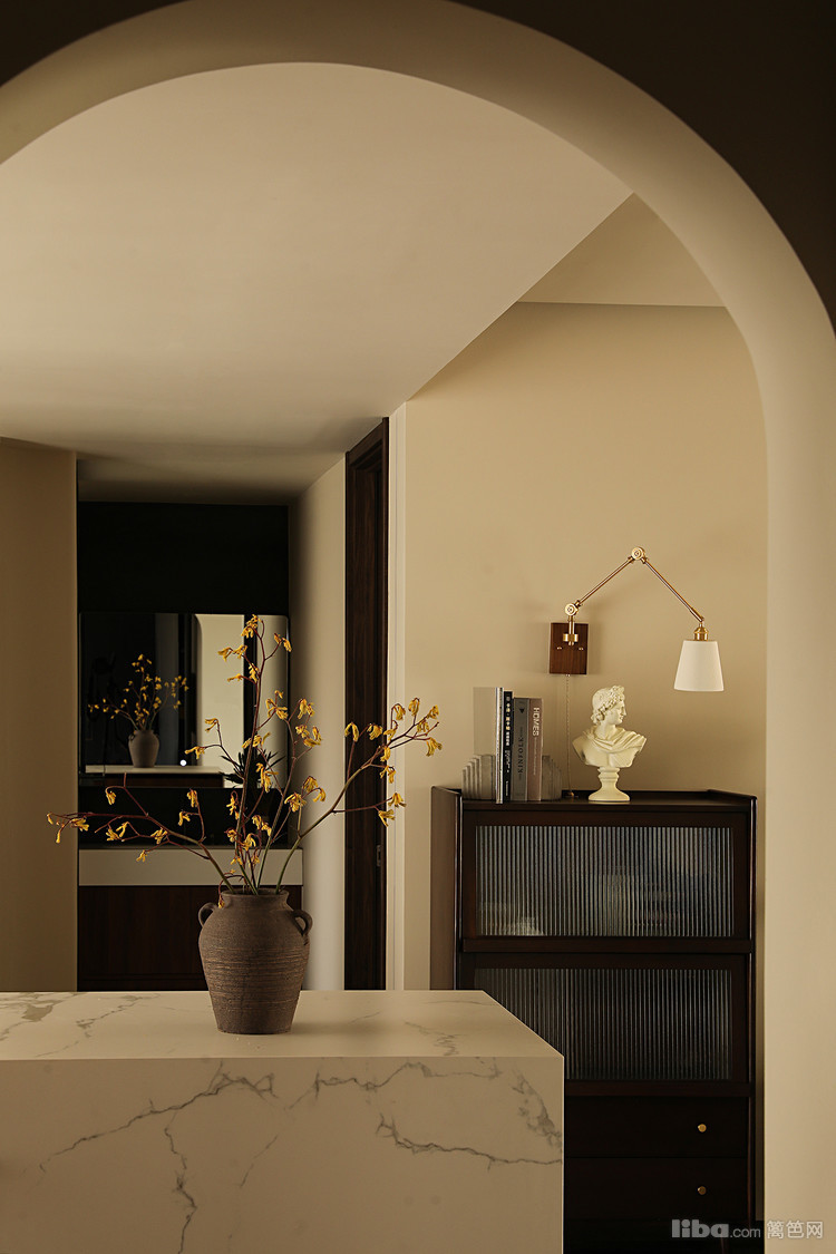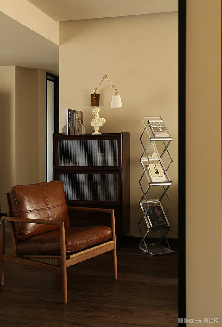 靠墙摆放深色胡桃木收纳柜,增加空间的氛围感,精致复古的摆件既能装饰空间,又起到储物的需求,提升居家幸福感
