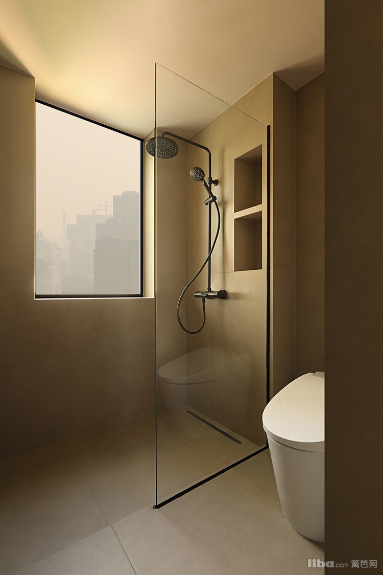 因为卫浴空间面积有限,所以将空间重新规划,浴室柜外置的设计可以满足多人使用,日常均不影响。浴室柜以深色原木为主,底部留空搭配台盆一体,视觉效果上干净舒适