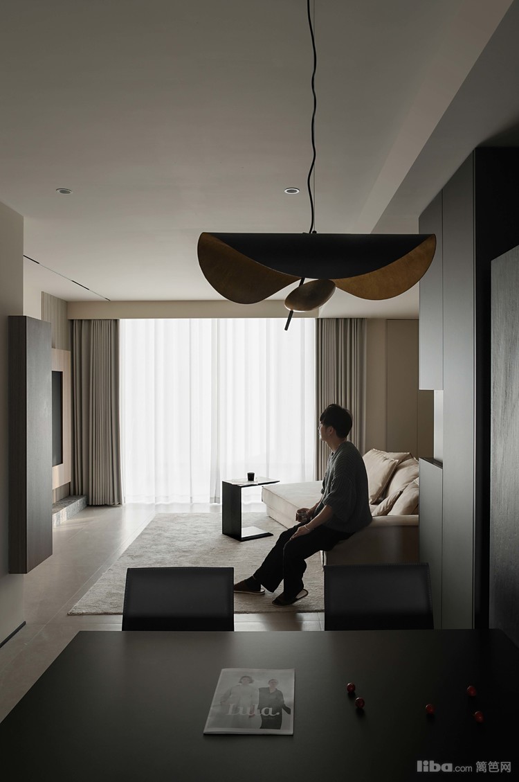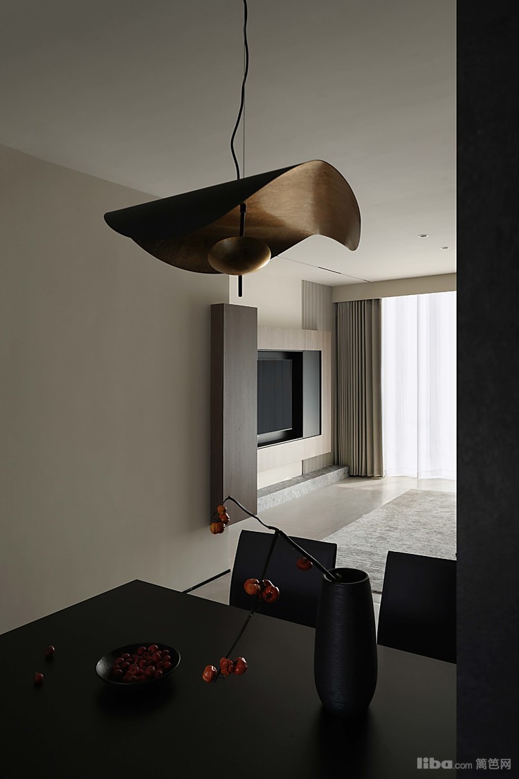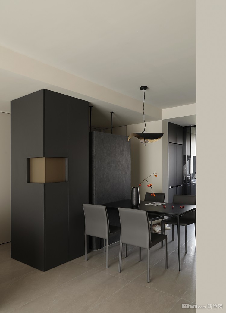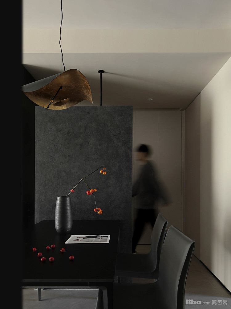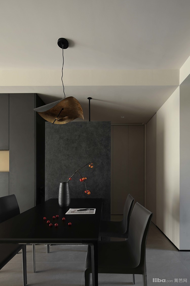 悬浮端景与餐桌相结合,围绕干区设计的洄游动线,提升空间的流动性和实用性。餐厅中的纯黑色餐桌和餐椅,搭配上方悬挂的拉丝金属双色吊灯,共同营造出一个现代而优雅的用餐环境