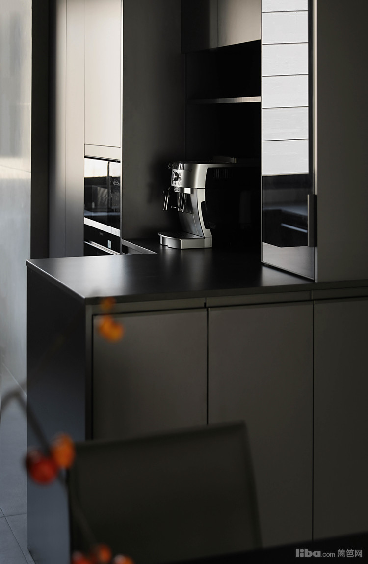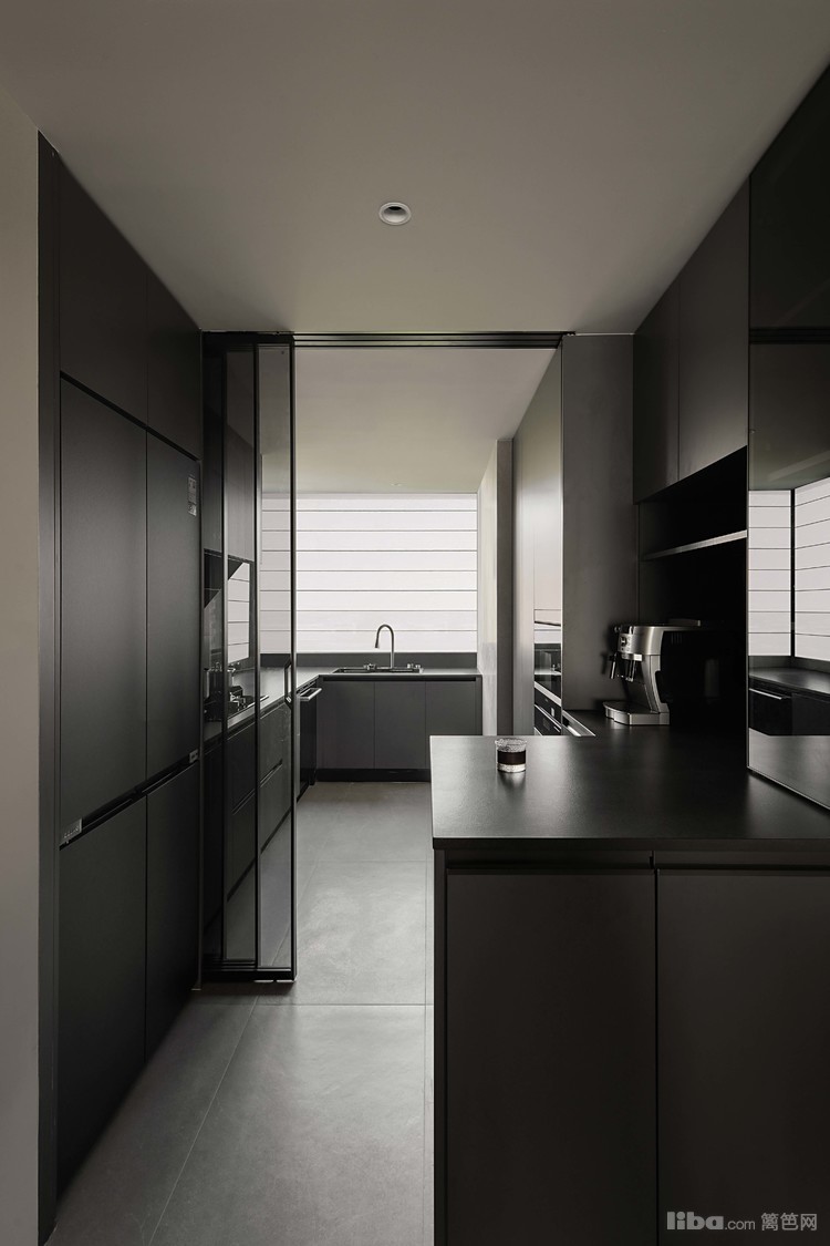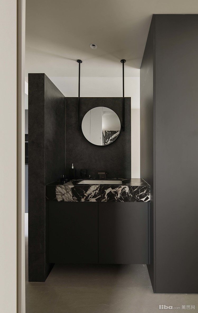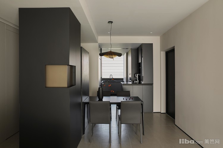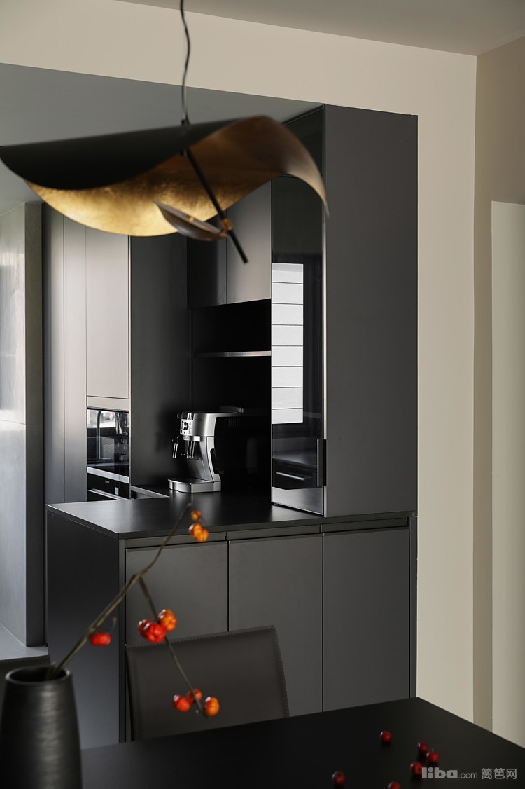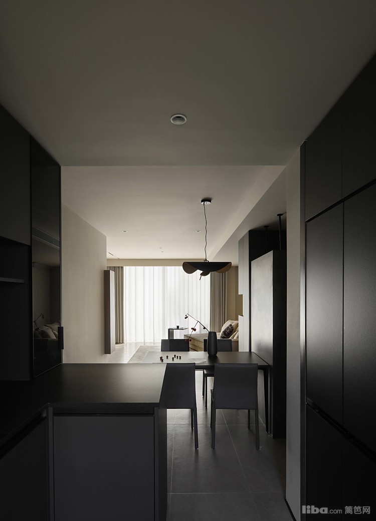 悬浮端景与餐桌相结合,围绕干区设计的洄游动线,提升空间的流动性和实用性。餐厅中的纯黑色餐桌和餐椅,搭配上方悬挂的拉丝金属双色吊灯,共同营造出一个现代而优雅的用餐环境