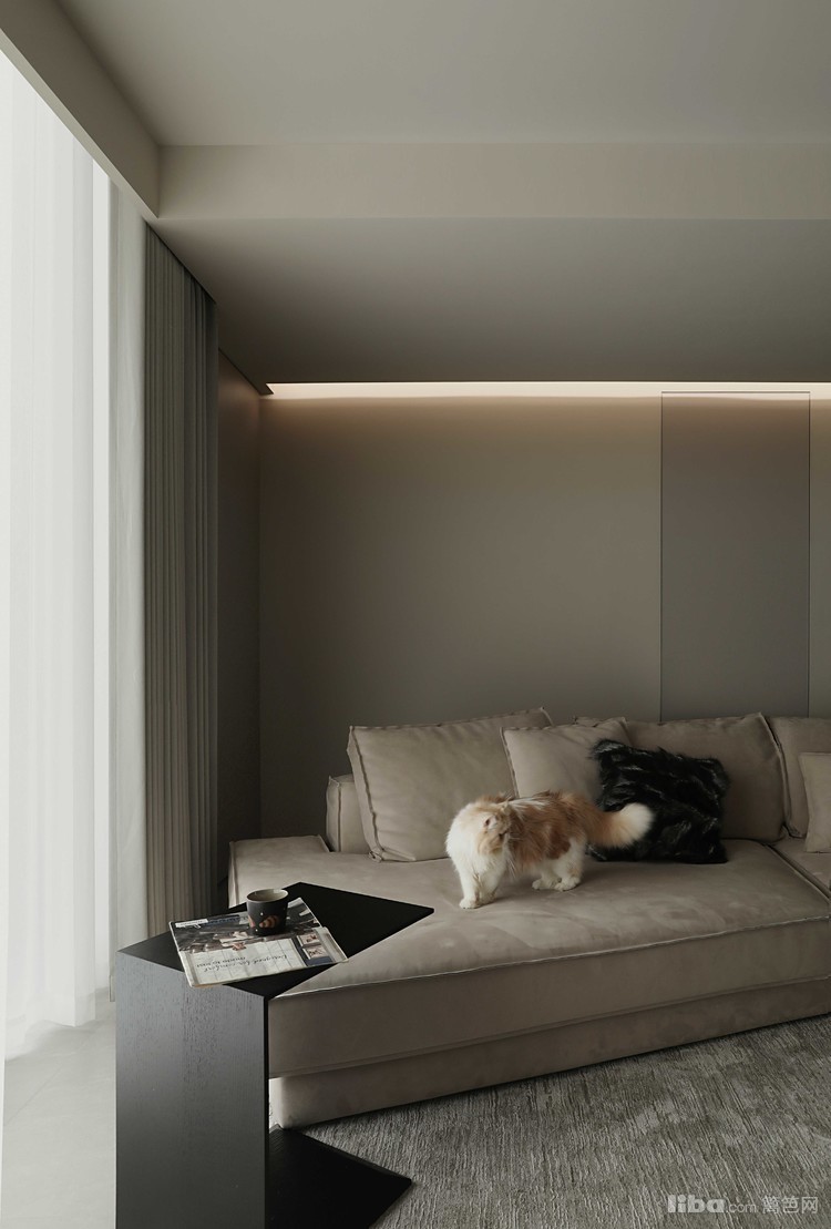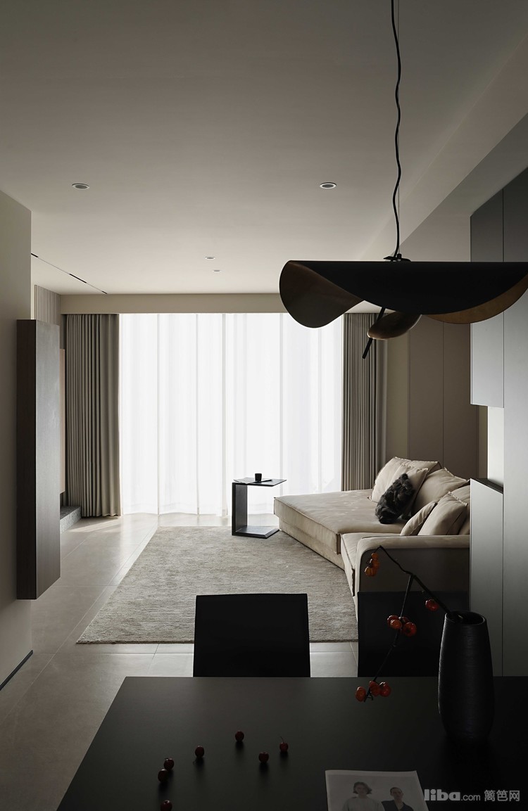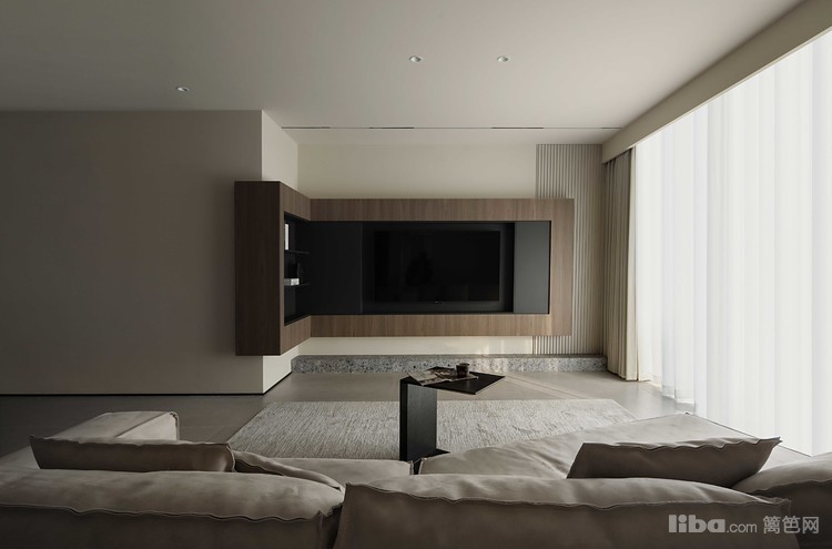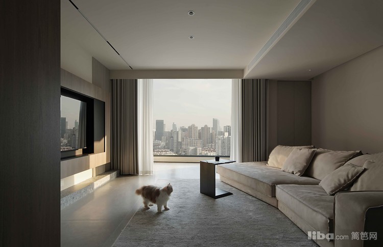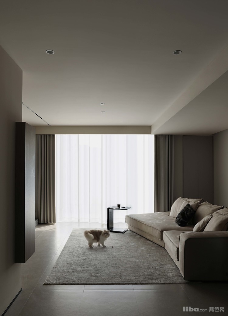 客厅以低饱和度的米灰色为主调,营造出宁静的氛围。宽敞的空间由大面积的落地窗和搭配的浅灰色窗帘与白色纱帘点缀,增加了室内的明亮感