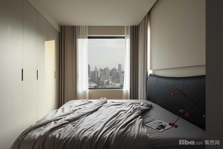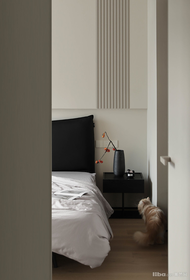 主卧以奶油色墙面为基调,配备黑色真皮的超大双人床,对面则是一扇通顶的白色极简衣柜,既美观又实用。