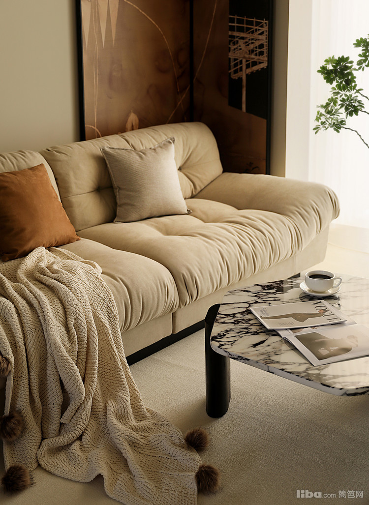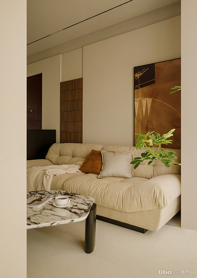整个公共空间以奶油白配色来实现提亮空间,辅助以橙色、黑色,然后局部点缀棕色和大理石元素