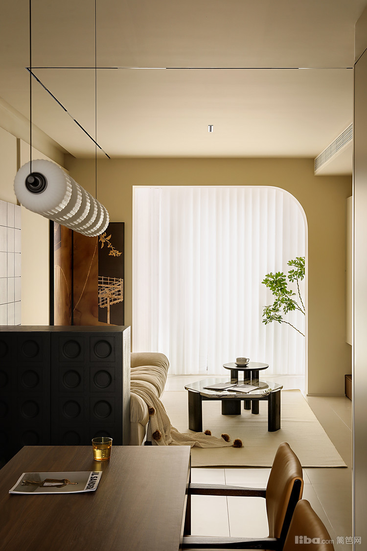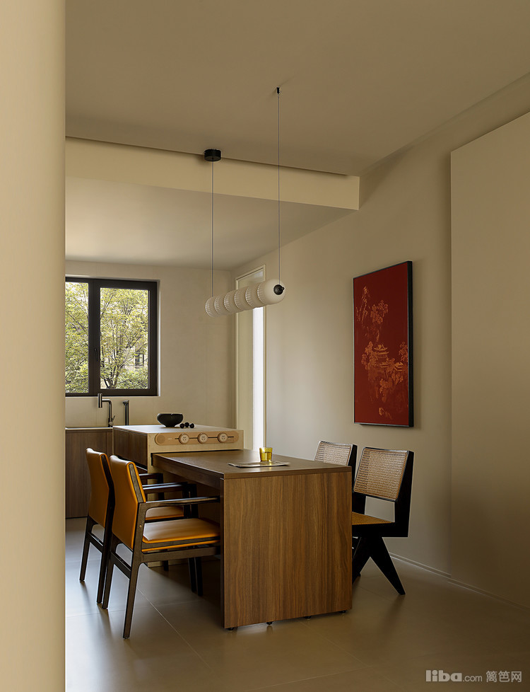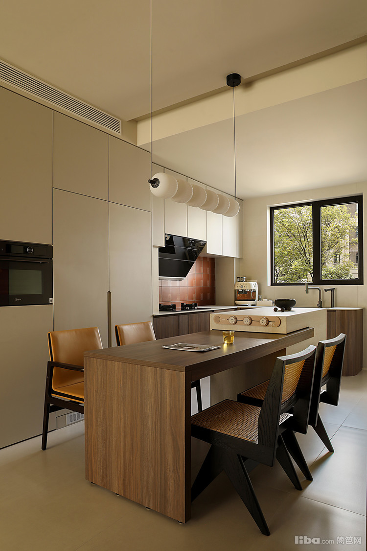 从客厅看向餐厨区,在拆除原有厨房墙体后,餐厅空间得以扩大,我们将部分餐厅空间给到厨房,采用开放式厨房+岛台的形式来解决原有厨房过小的问题