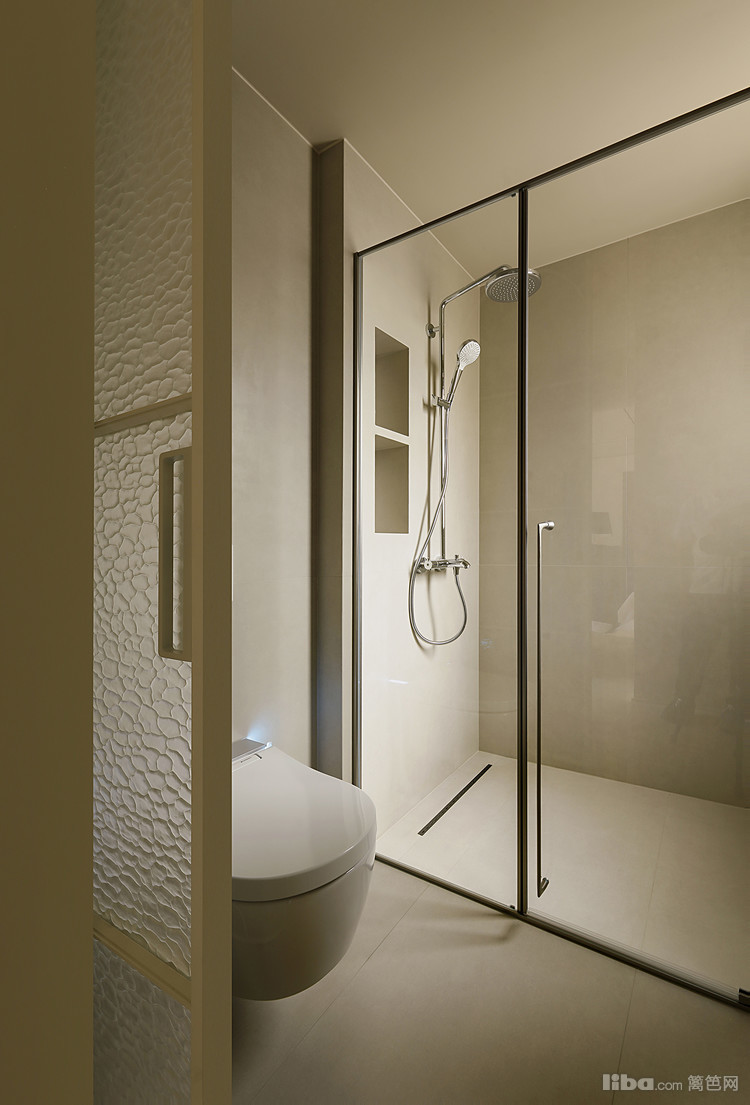 卫浴的空间比较窄小,合理规划空间做干湿分离卫生间设计,淋浴房、马桶、定制面盆浴室柜,玻璃透明隔断将空间进行划分。超大镜柜满足日常收纳,大面积的浅色呈现出干净清爽的浴室氛围