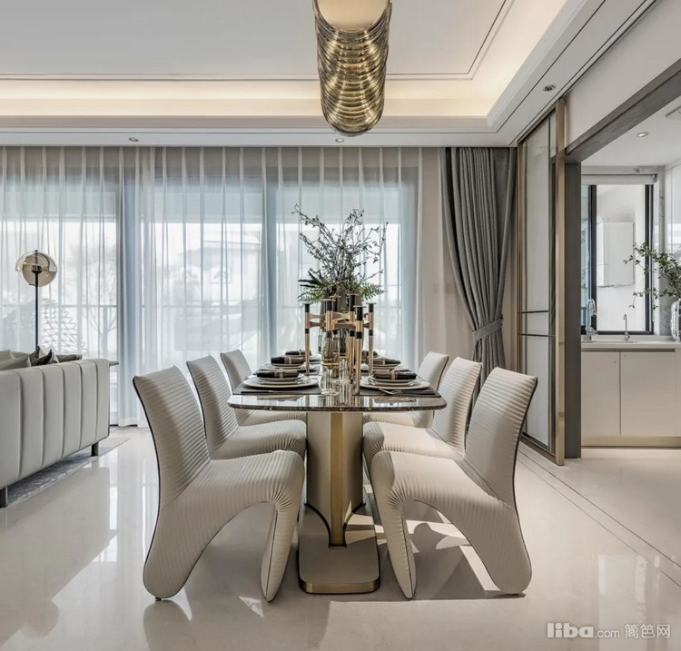 餐厅与客厅以横厅的格局,摆上大理石台面的餐桌,搭配皮质的餐椅摆设,让用餐空间显得情趣舒适而优雅自然。