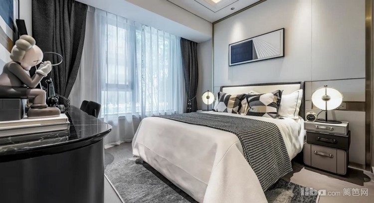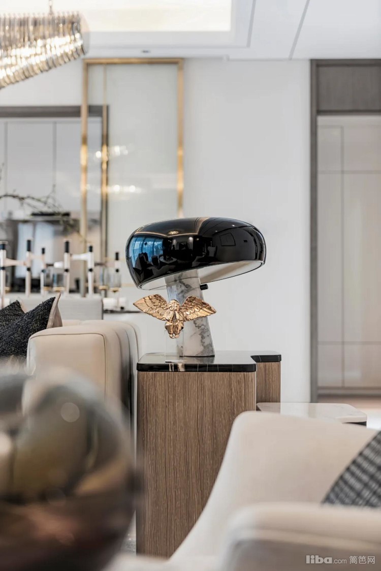 沙发旁边布置一个矮柜,摆上一个蘑菇与金雕造型的装饰,让空间显得更加艺术雅致。
