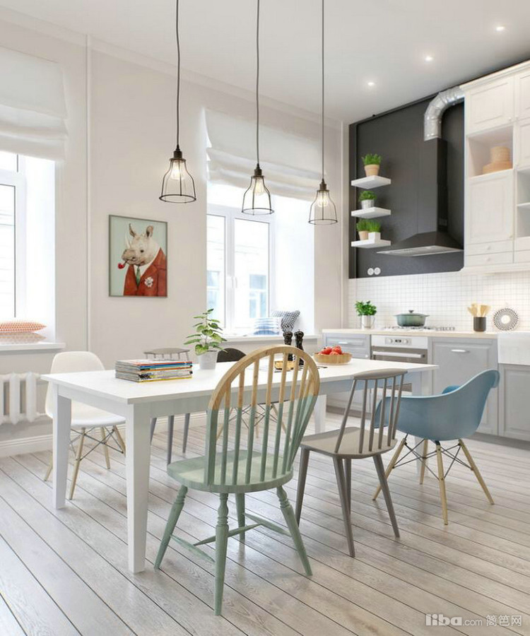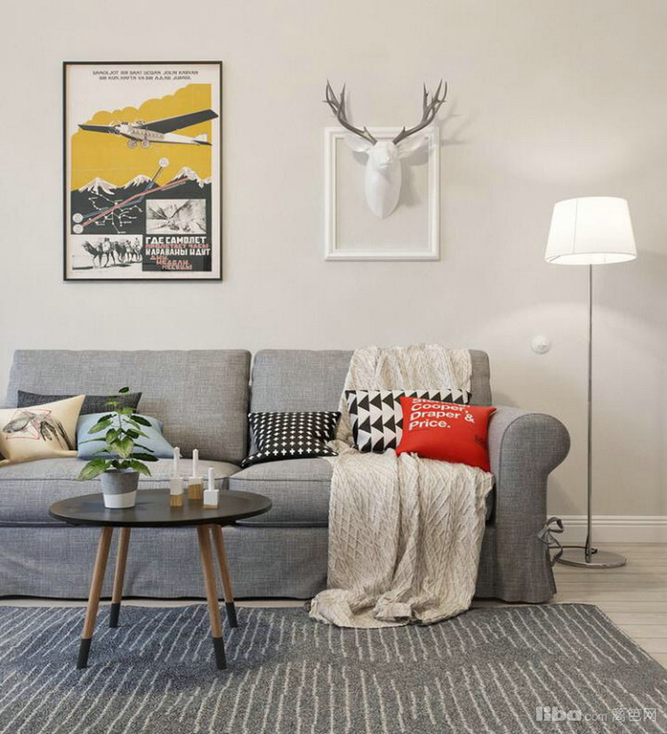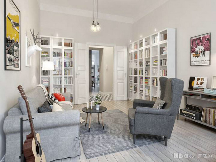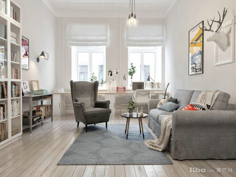 以白色为主色调,客厅面向阳光的地方可以作为办公区域,累了可以直接躺在沙发上,具体有设计感的灯装饰