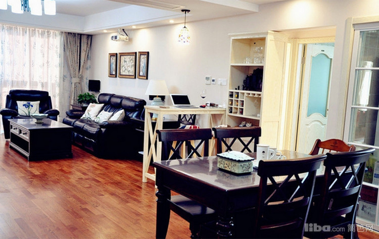 客厅的小吧台是业主非常喜欢的,原木吧台,品酒,办公,一切刚刚好,真皮沙发质感不错,餐桌旁边的储物柜满足了业主的收纳功能