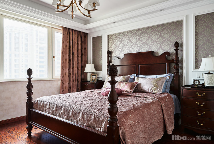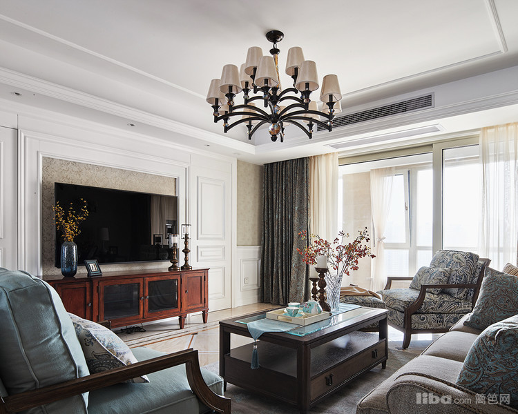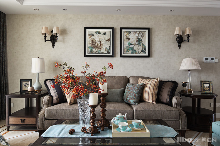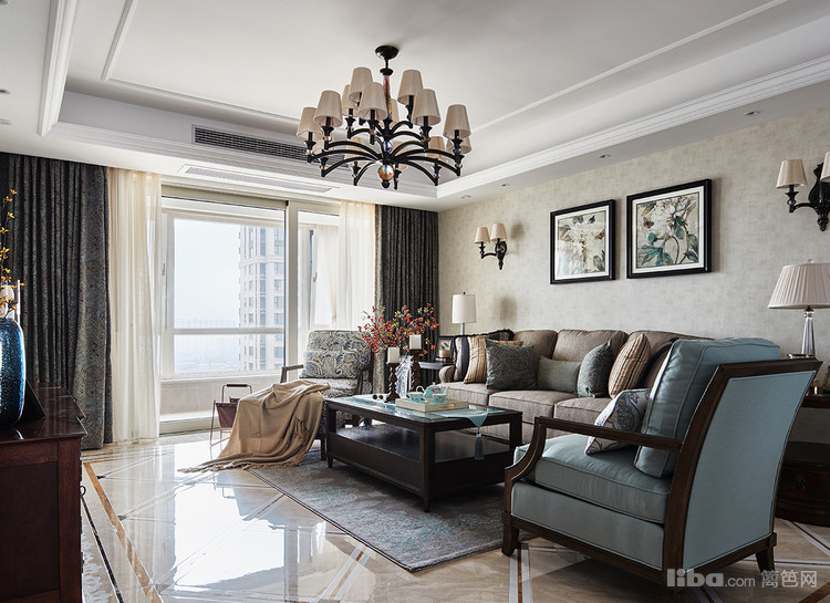 整体设计为美式风格,无论是布艺的沙发还是实木的家居在色彩上都采用深色系色调,大气美观