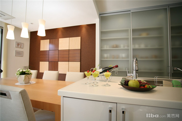 大面积的嵌入式储物柜合理的节省了空间,使餐厅看起来更加的整洁和开阔。简易的灯具又不失设计感,表现了主人的生活态度。