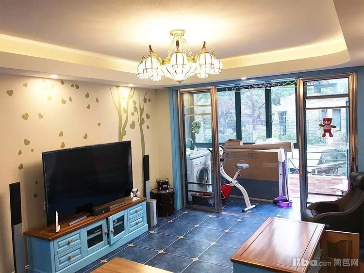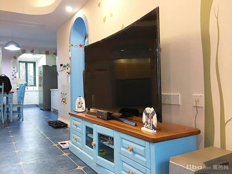 客厅是整个房子最大的一个空间,整个格局较为开阔,客厅的家具如茶几、电视柜等,都是由蓝色搭配原木系,随处可见的“贝壳”、“海星”、“海船”等元素