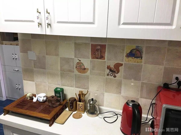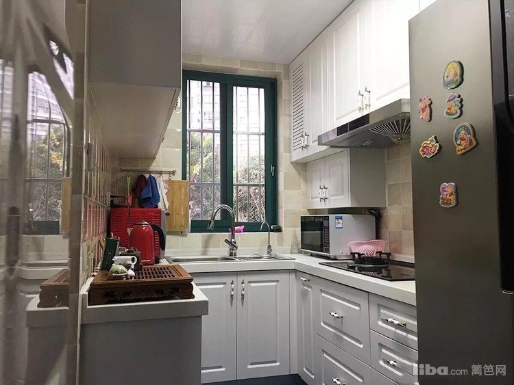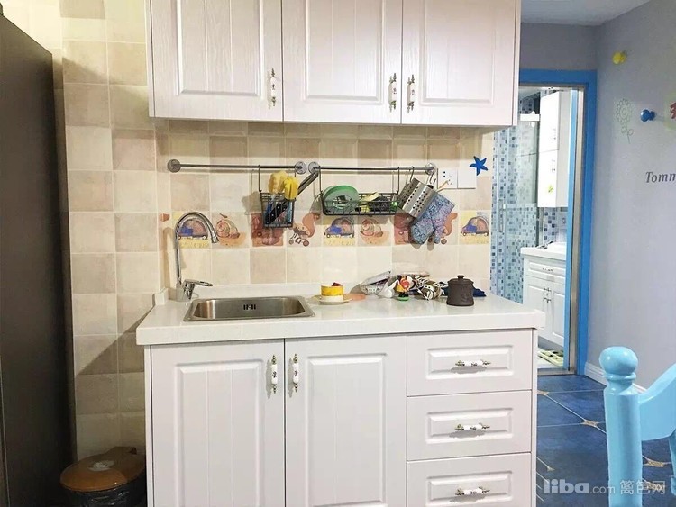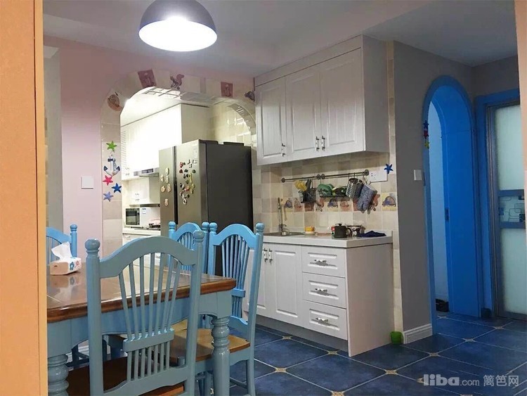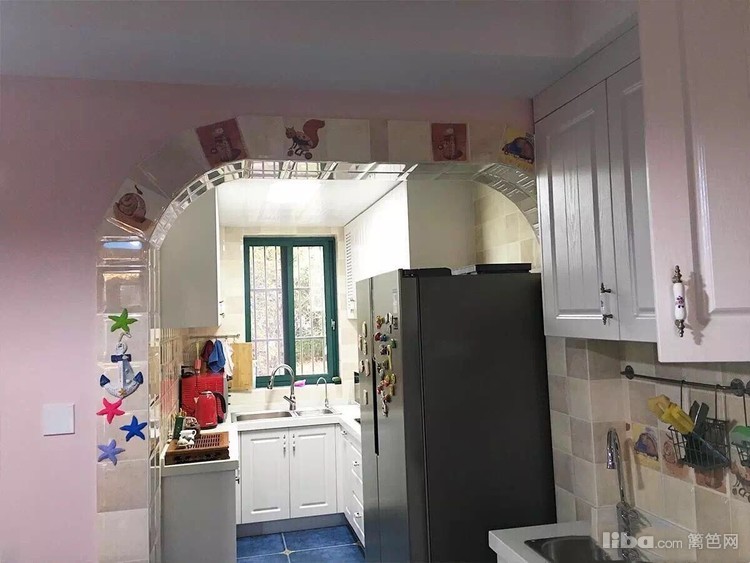 厨房门是半圆形的,用花样的瓷砖拼贴成,配上了一些“海星”、“船锚”的元素。厨房以白色的“回”字橱柜为主,显得非常的素净淡雅。