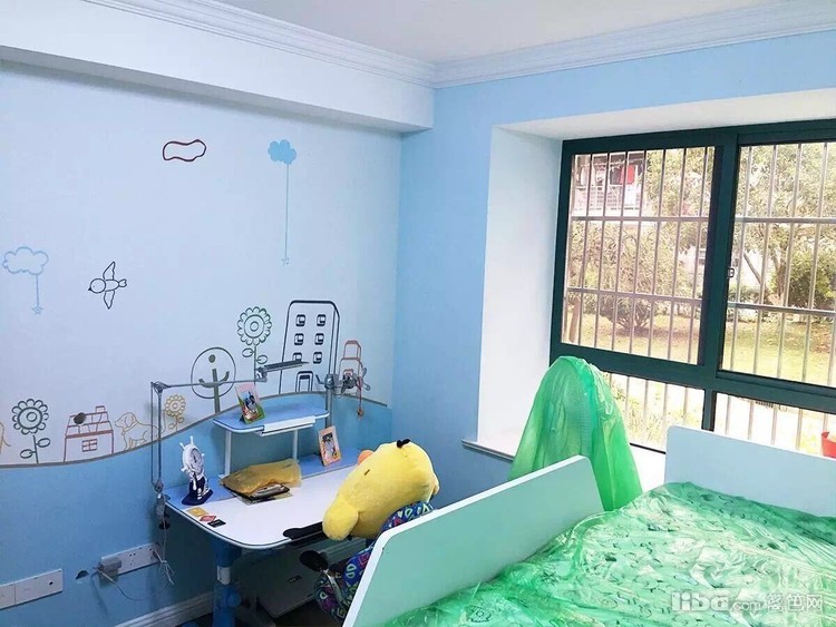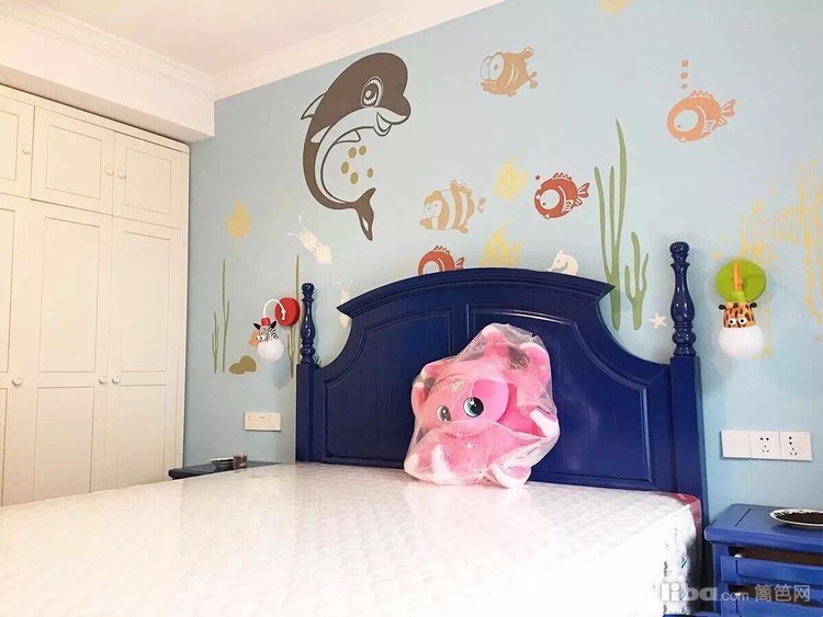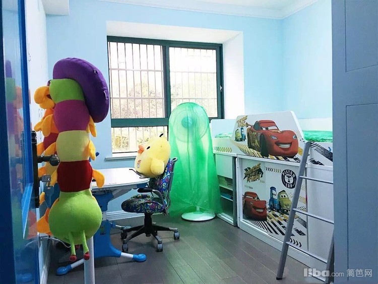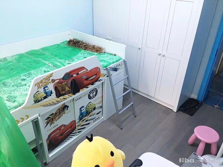 主卧沿用了地中海风惯用的蓝白色调,素净的白色和灰蓝色,带着复古风的吊灯让地中海风格更加强烈。双层的儿童床增加储物功能,床上是孩子喜欢的卡通形象。