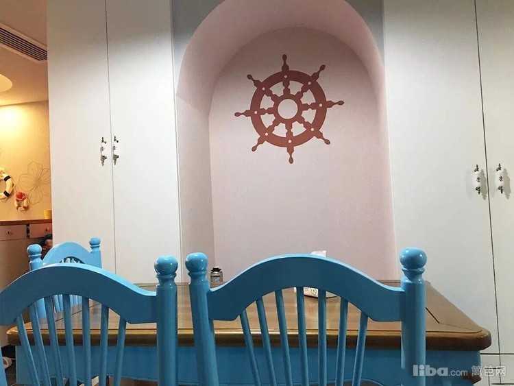 为了与门框、地砖的蓝不重复,餐厅处采用浅蓝与纯白搭配。两个柜子中间空出了一“拱形”深陷,船舵的造型的贴纸起到了画龙点睛的作用,在这里用餐让人觉得置身于甲板之上。