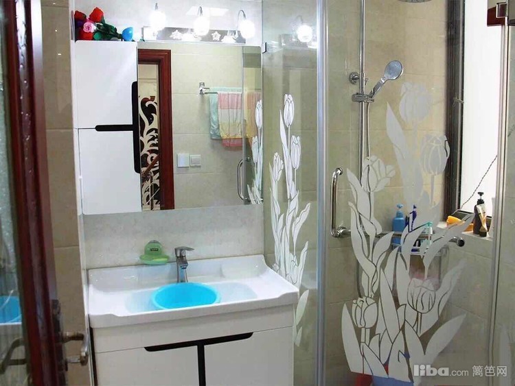 卫生间的空间不是很大。为了增加使用面积,一楼的卫生间中淋浴区用玻璃门隔离出一块五边形的空间,左右两侧分别布置了一个洗手台与马桶供户主夫妇使用。