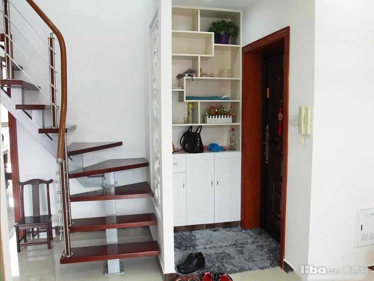 玄关与楼梯用一块白色花纹镂空板隔离开来,并不会在开门后显得空间局促,又能区分出玄关与生活区。