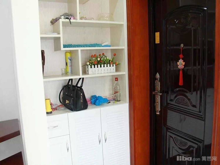 玄关处打造了一个白色的柜子,下面的柜子作鞋柜用,上面的隔层则可以随手放置一些小物件,包之类的。