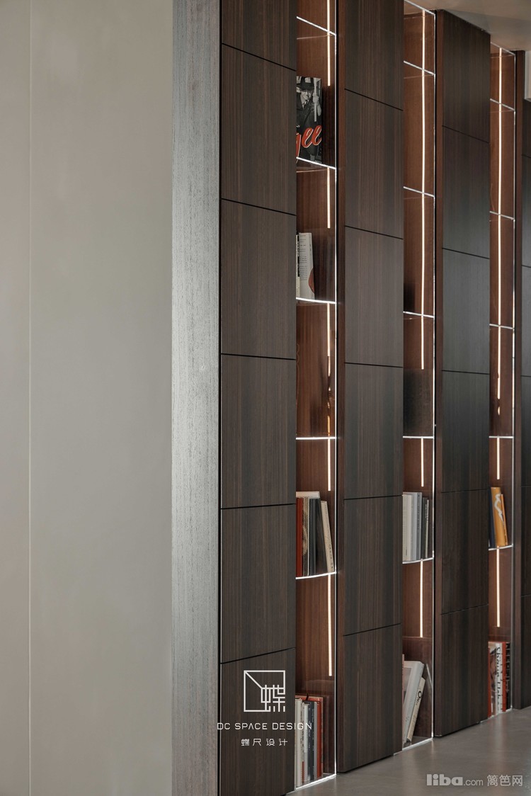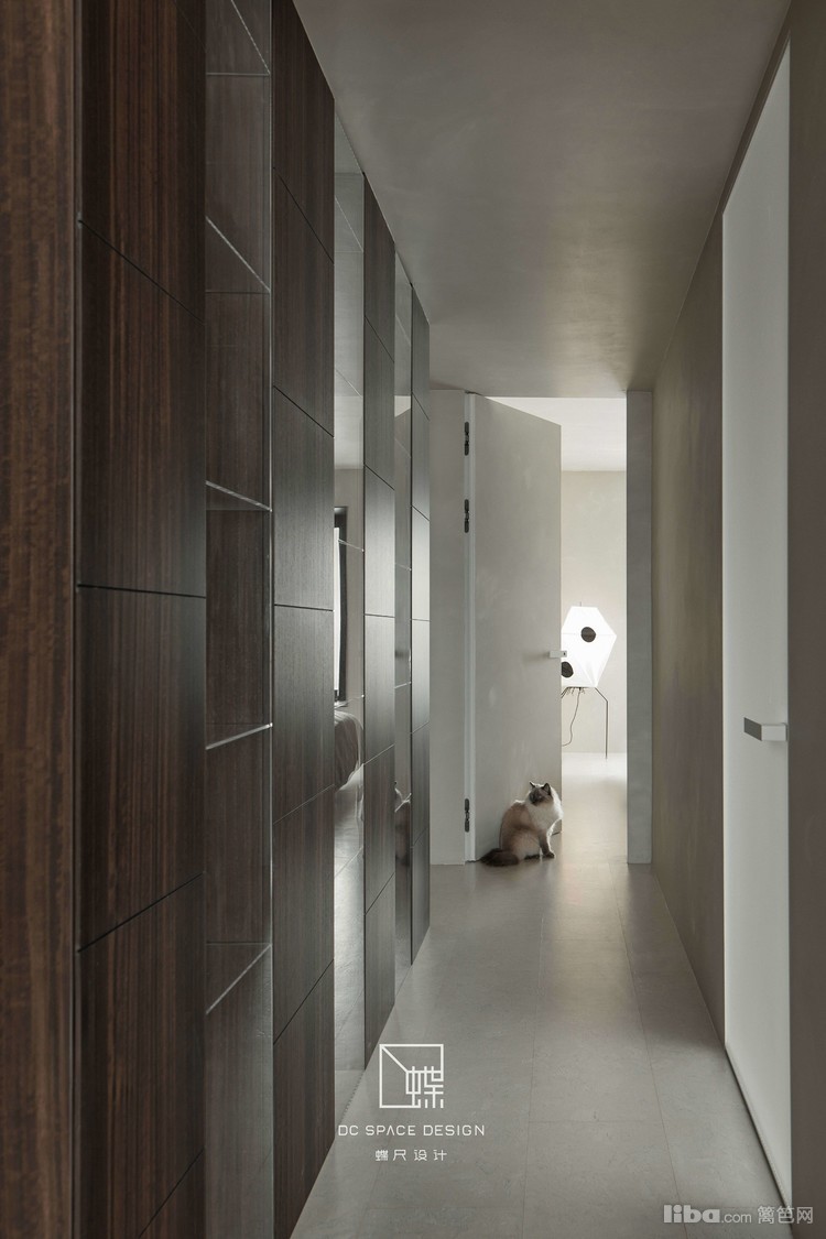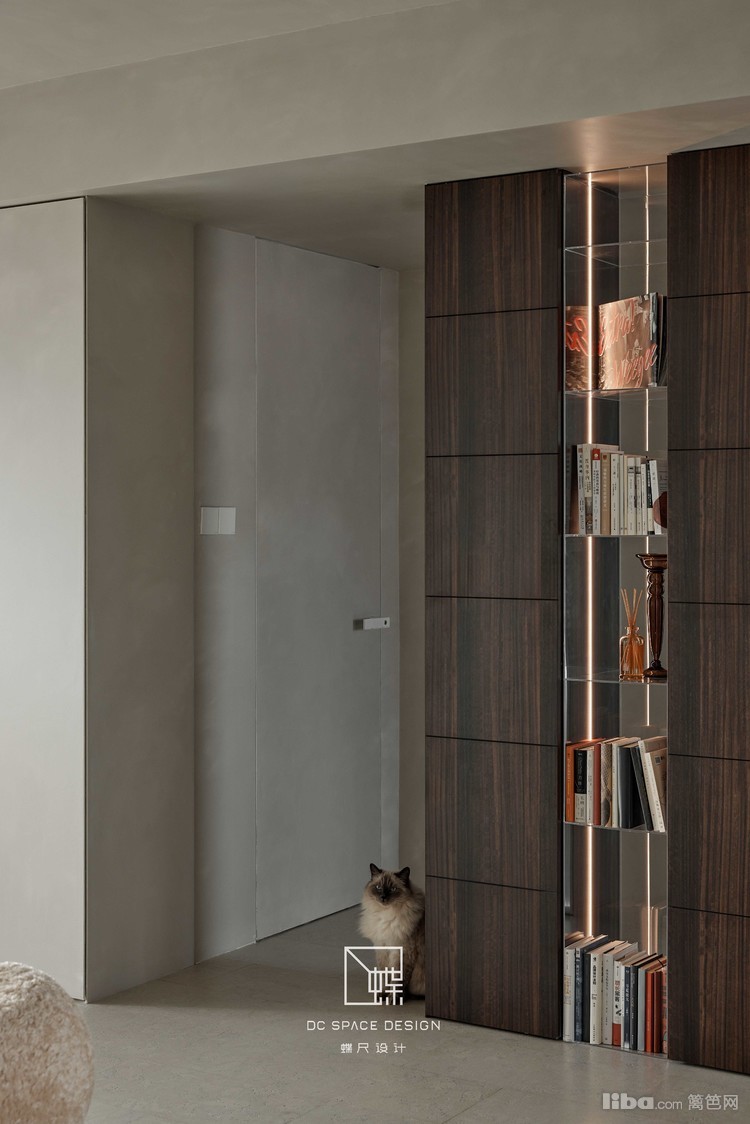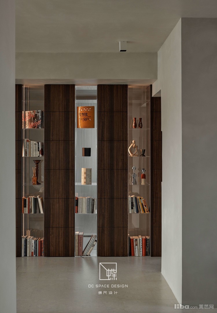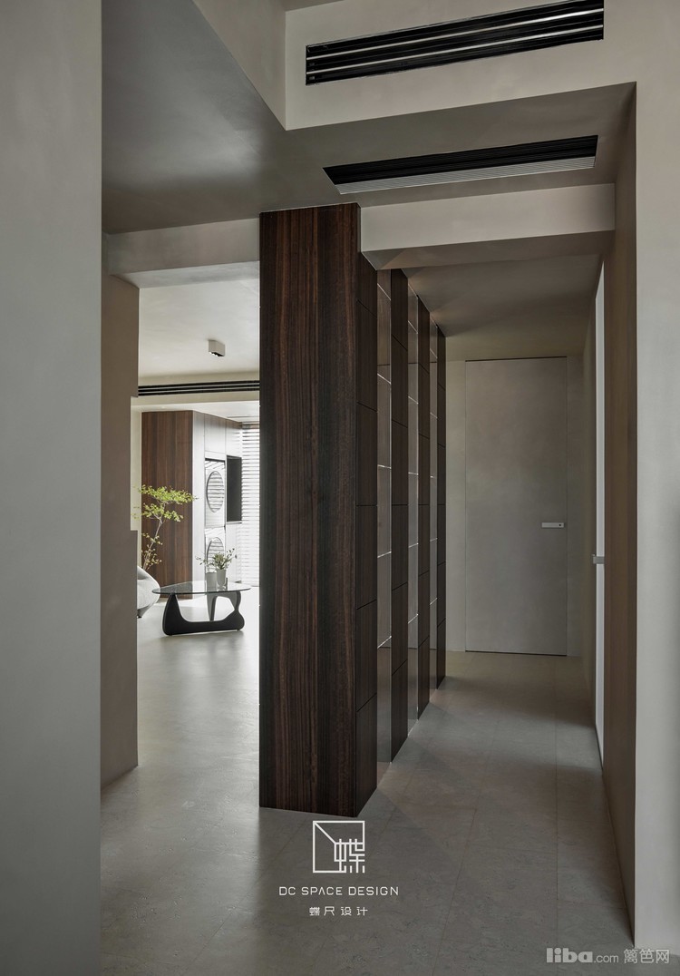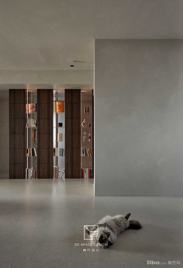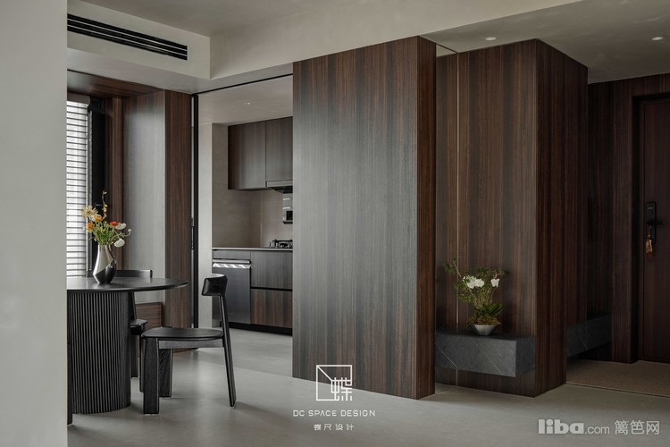 入户见屏,烟熏胡桃木与透明亚克力组合柜替代隔墙,半遮半透,空间绵延无绝