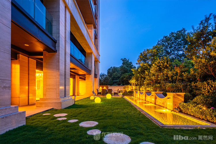 花园区域阳光充足而且建筑南侧通透需要良好的景观来围合,建议在南侧设置较为大型的水景使花园更加大气以及