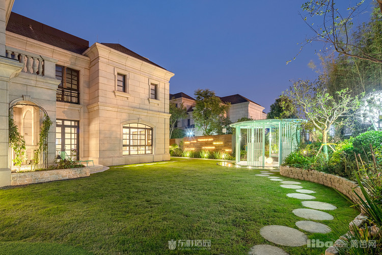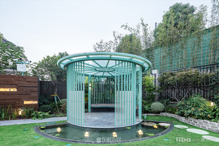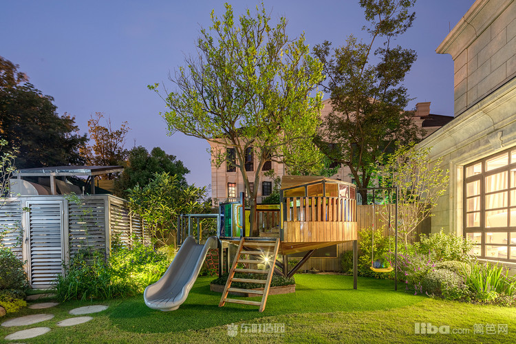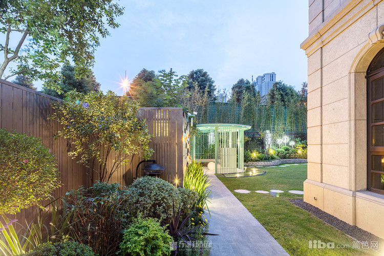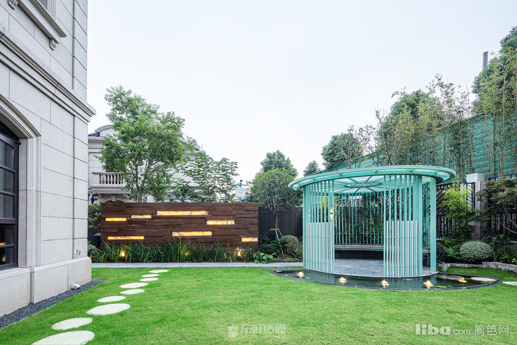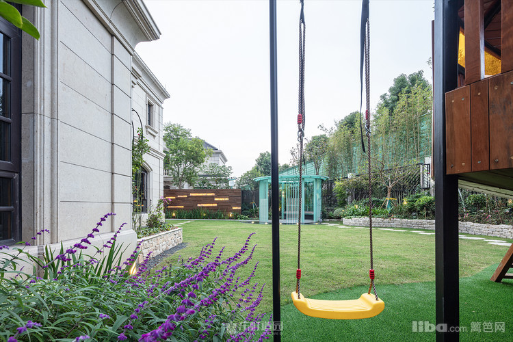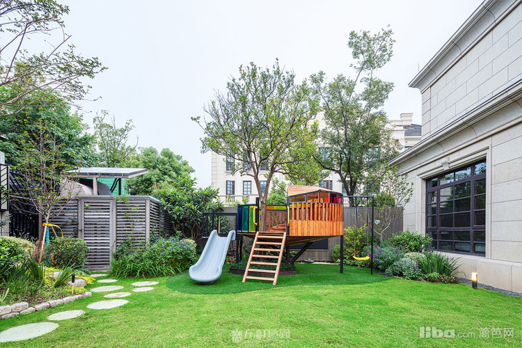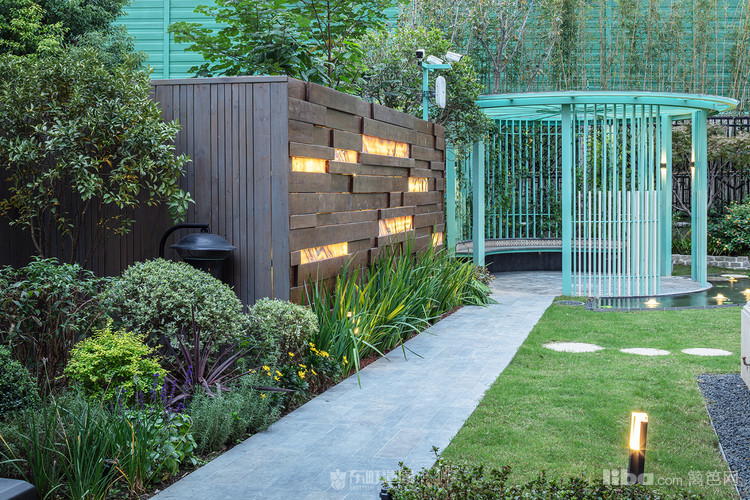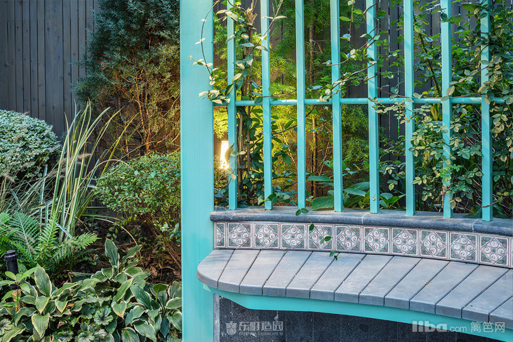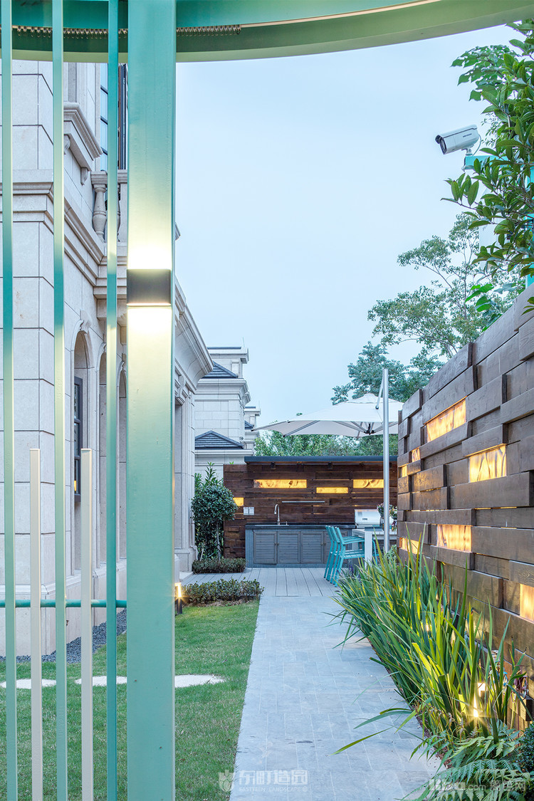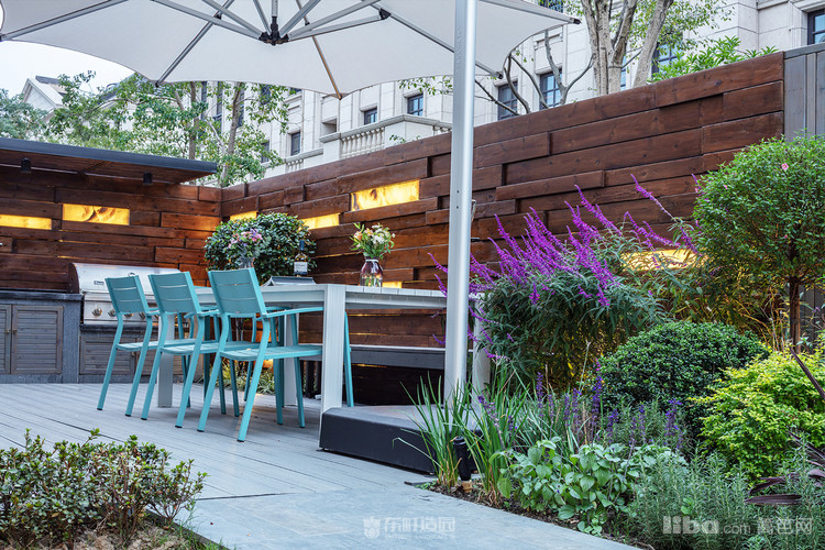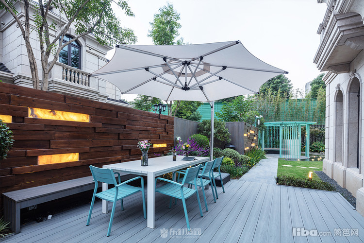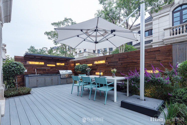 木质景墙搭配灰色系地面,与白色、蓝色系户外家具结合形成深色与浅色的交织,不失美式的怀旧与贵气