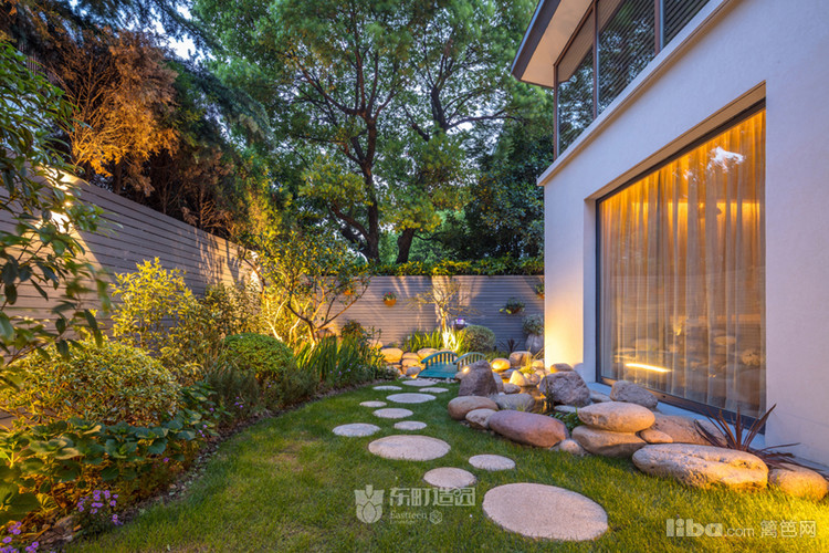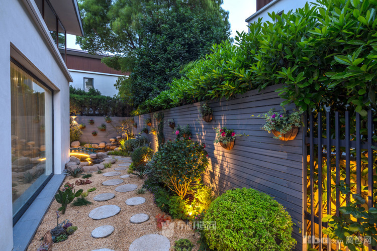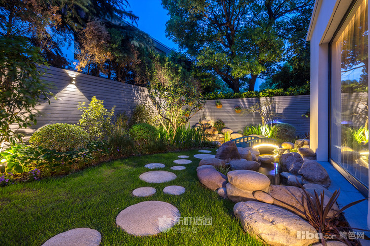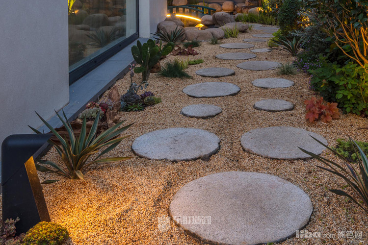 细小的黄金砂砾与圆形的硬质石板搭配,周围配置植物与置石,营造出枯山水的效果