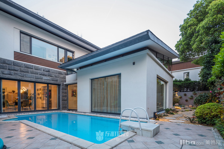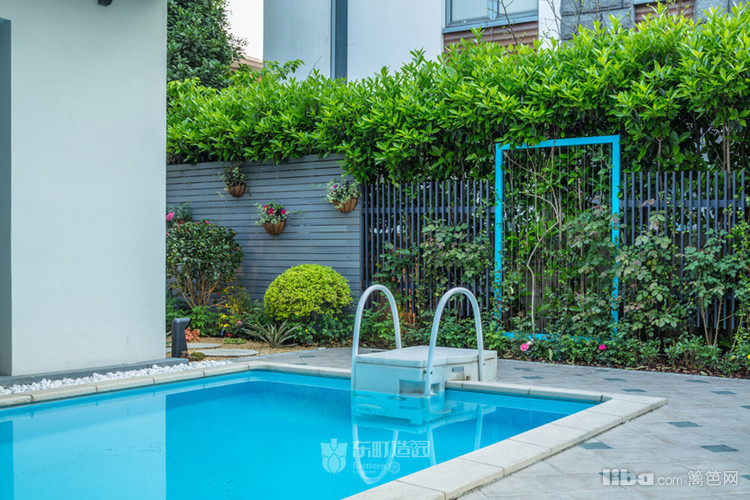 白色建筑搭配蓝色泳池,清爽大气。与之搭配天蓝色爬藤架,提升了整个空间的格调。
