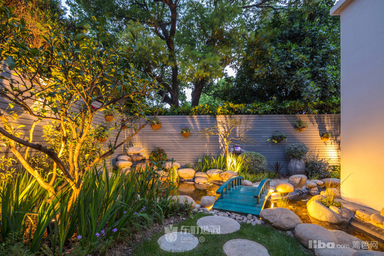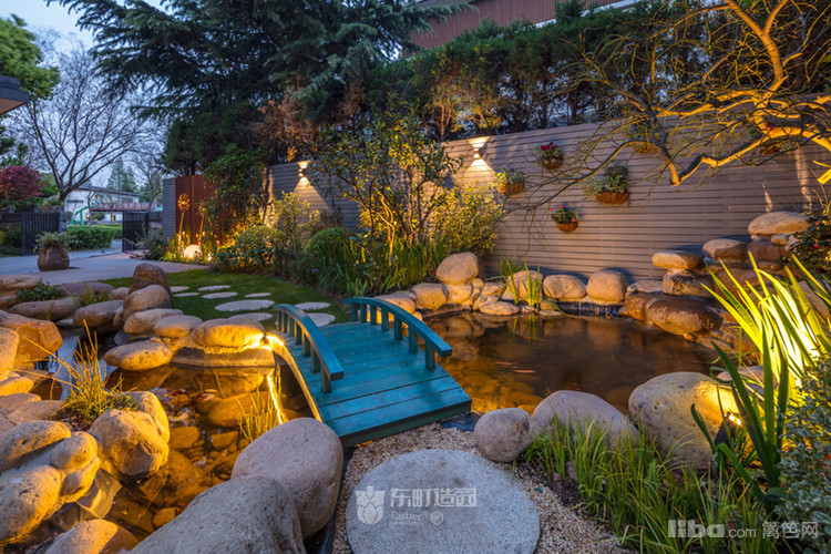 石头堆砌出的假山水景支上的蓝色小桥,个性又增添颜值。